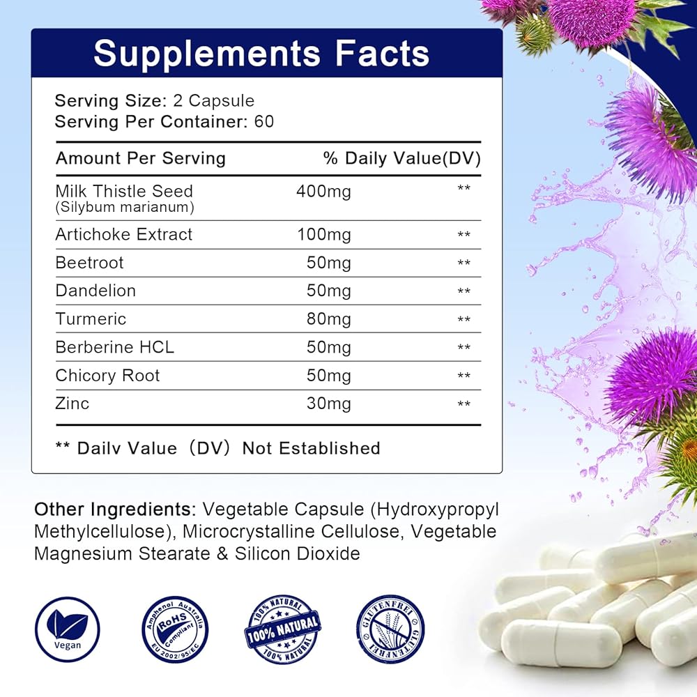 👍Liver Support - Milk thistle contains a flavonoid called silymarin, which helps protect the liver by optimizing liver function and detoxification. Dandelion root aids liver function through toxin removal and bile production.