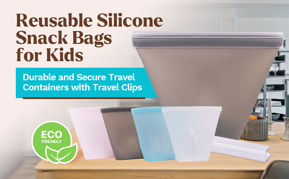 Reusable Silicone Snack Bags for Kids - Durable and Secure Travel Containers with Travel Clips | Food Pouches for Toddlers, and Young Children | Eco-Friendly and Easy to Clean Silicone Bags - 4 Pack