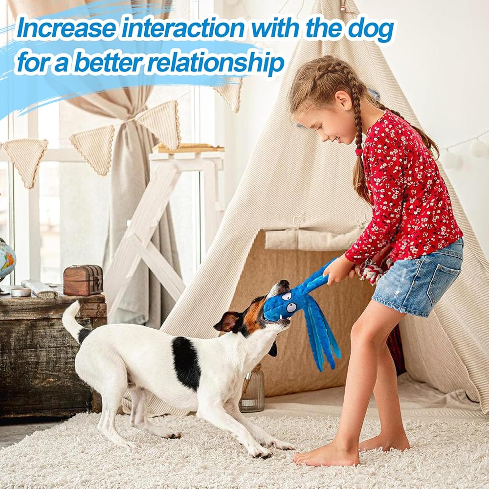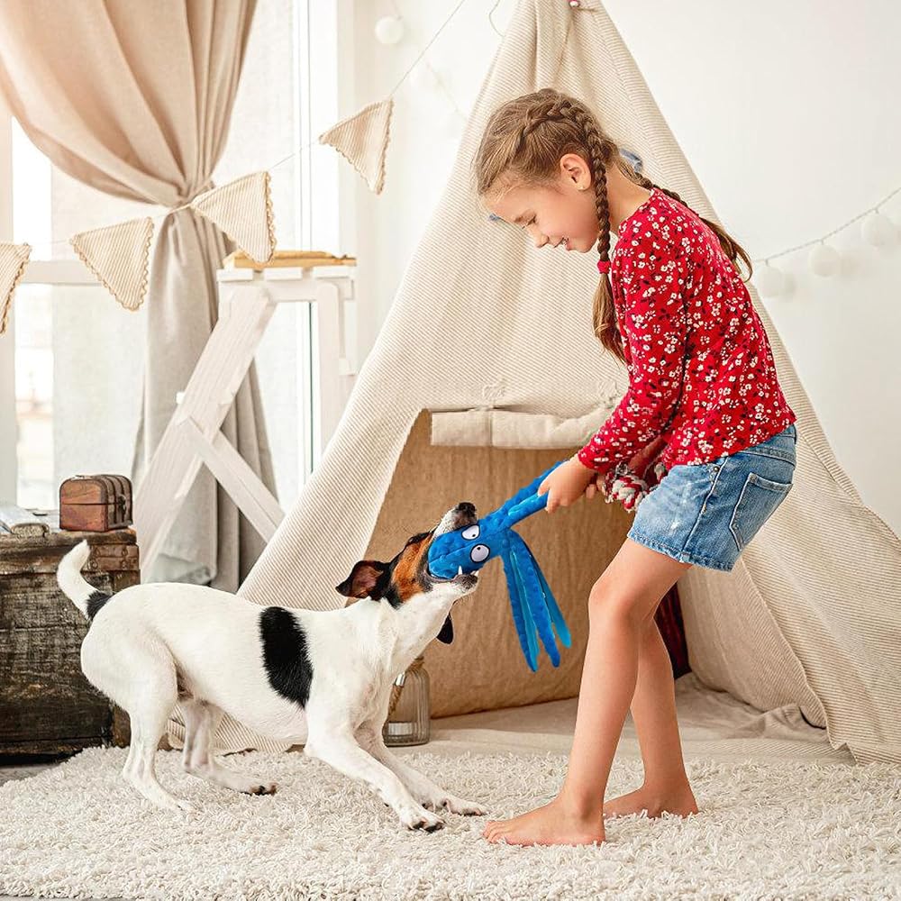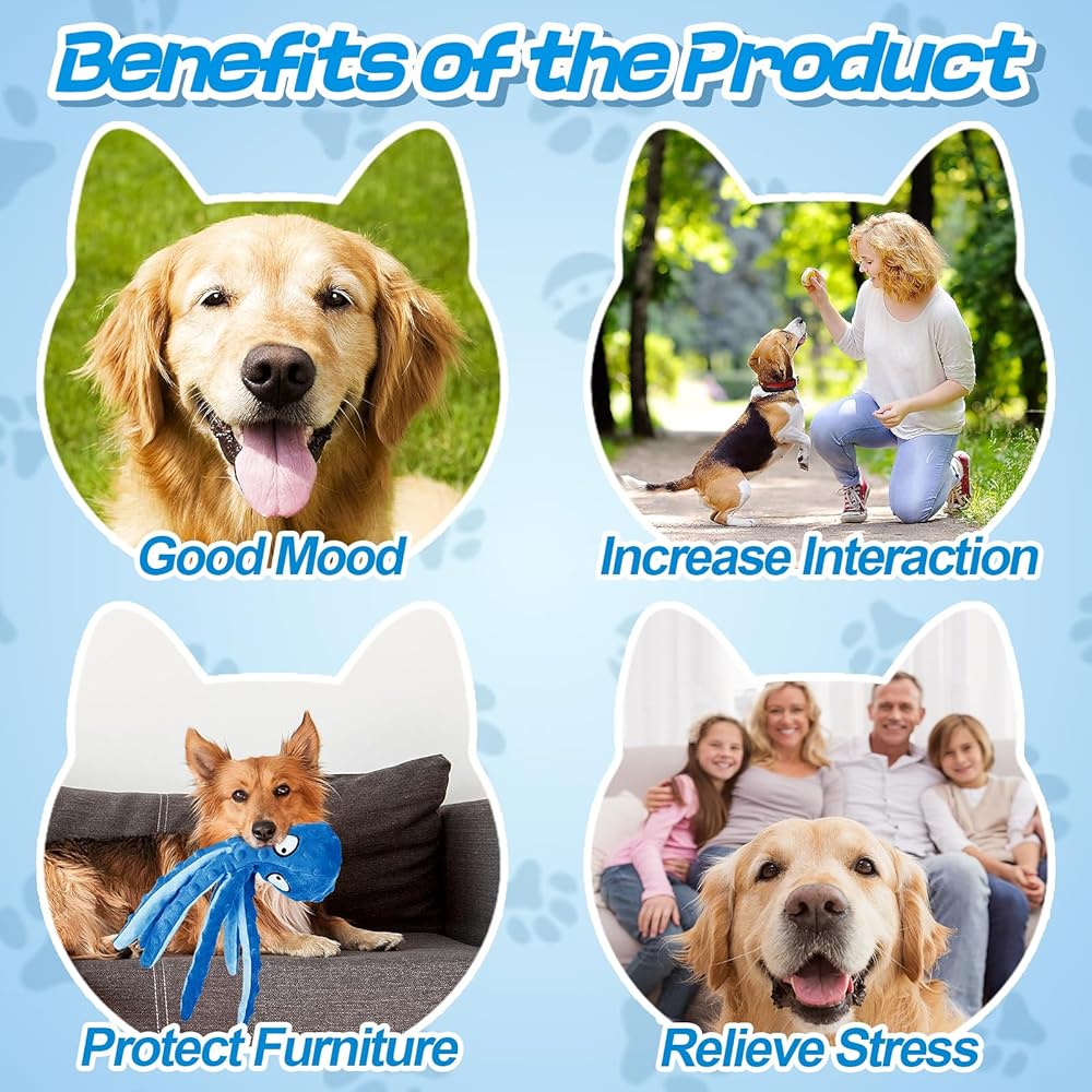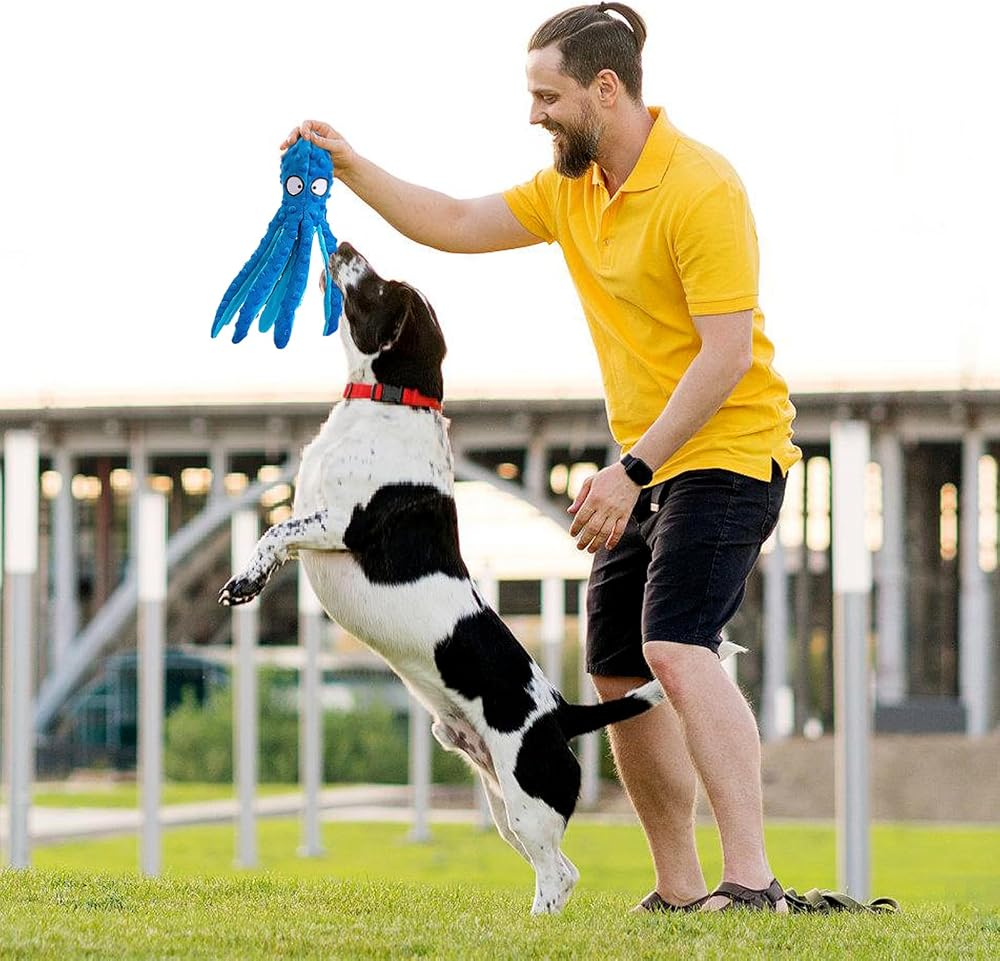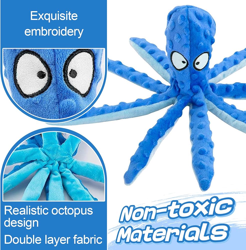 Squeaky Design: Our dog squeak octopus toy for aggressive chewers has a squeaker in the head and crinkle paper in 8 tails, which can make sounds when they are playing. And with sensitive hearing ability, your pets must be totally fall in love with this toys and fondle admiringly.
