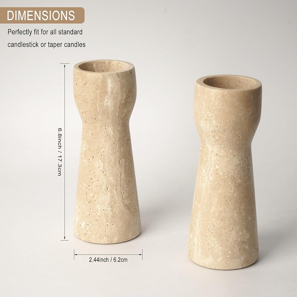 【100% NATURAL MARBLE】This set of candle holders is made from Travertine Natural Solid Marble, which gives a heavy duty, are sturdy, stable for supporting candles. We don't fill the tiny holes on the surface of travertine pieces in order to keep a naturally prime look. Since natural marble is environmental friendly, radiation free, our holder set is safe to use and easy to clean the wax.