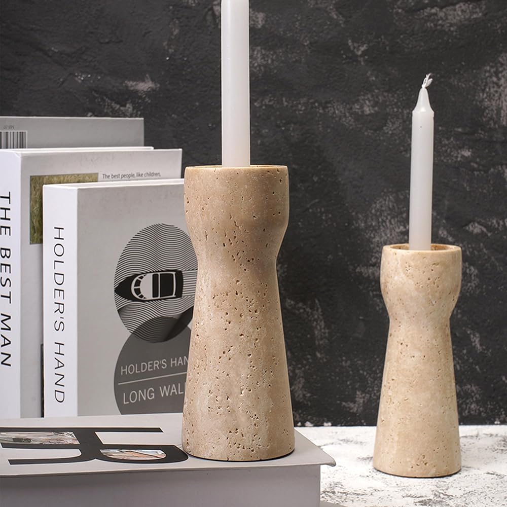 WORHE Candle Holders Italy True Natural Travertine Stone Set of 2 Pillar Taper Candlestick Holder for Home Dinning Party Wedding Modern Christmas Decor Premium Candles Stand Beige (WH036)