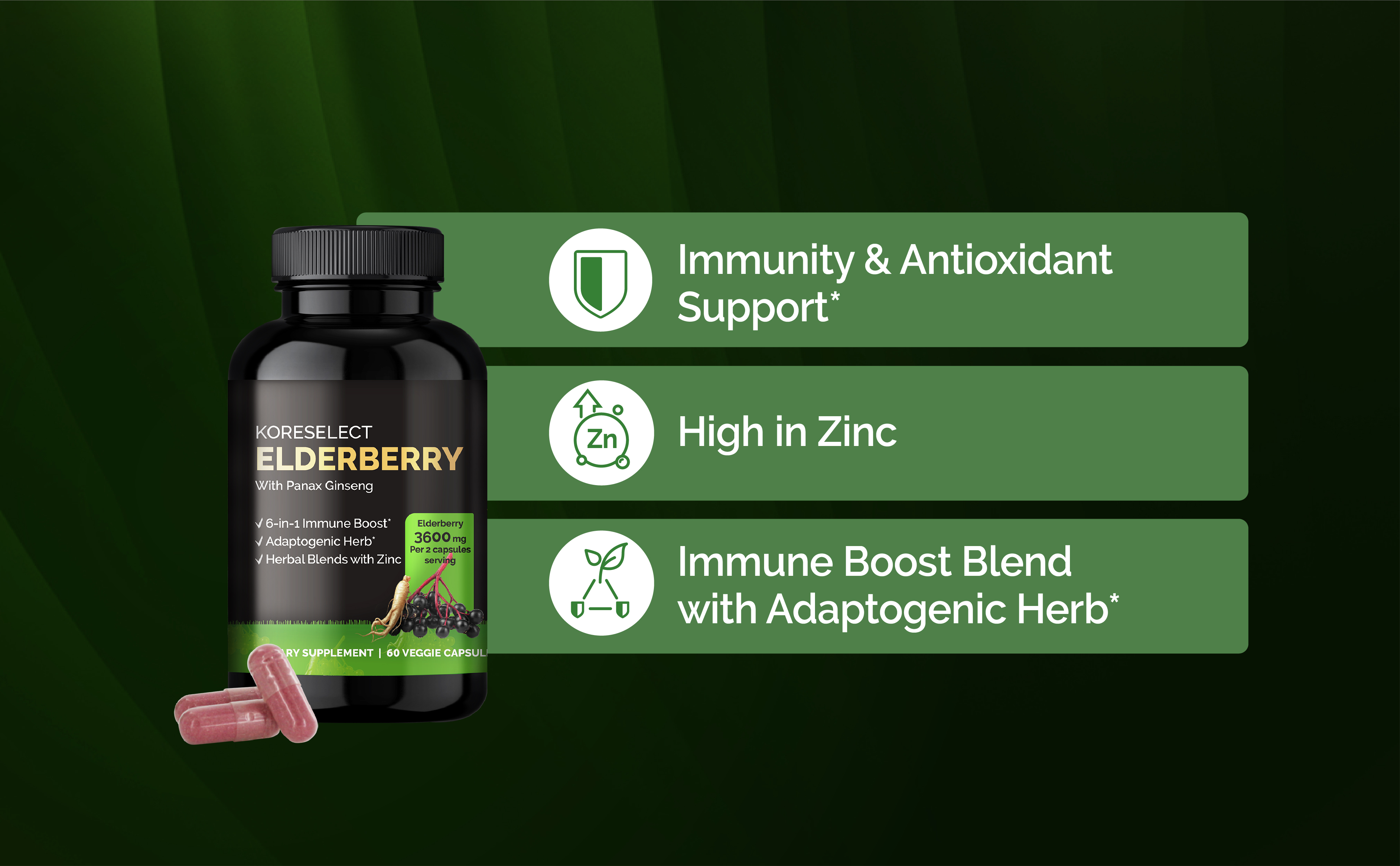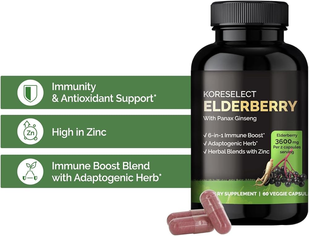 Formulated with 3600mg of Elderberry and 100mg of Panax Ginseng Extract - this powerful blend provides essential vitamins, including vitamin c, and is beneficial for your heart health. With KORESELECT Elderberry, you can enjoy all the benefits of elderberry in convenient capsules that are easy to take on-the-go.