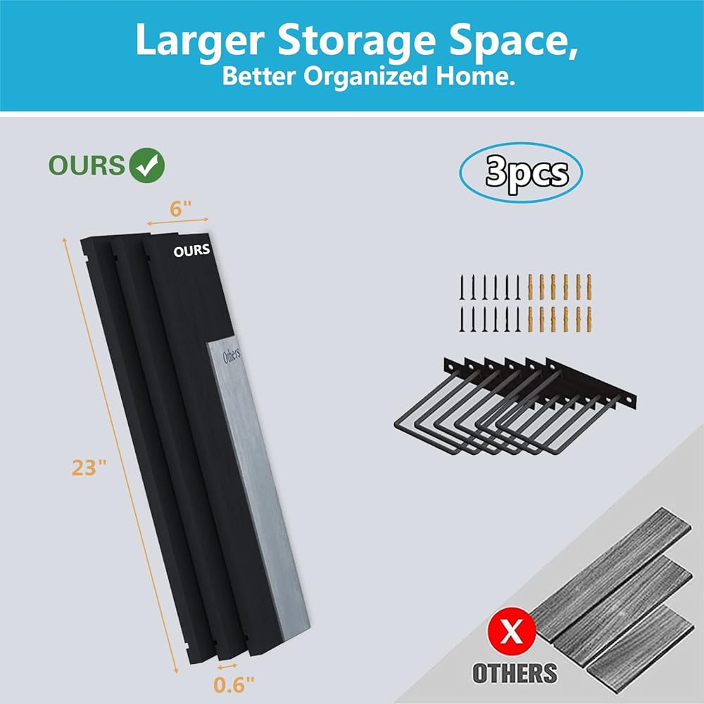 [Package Contents & After Sales] The package contains 3 same size wood shelves, 6 black metal brackets, 12 screws, 12 plastic anchors, 1 installation instruction manual. Further, we offer a lifetime guarantee, if you are not satisfied with the product or any queries, please feel free to contact us