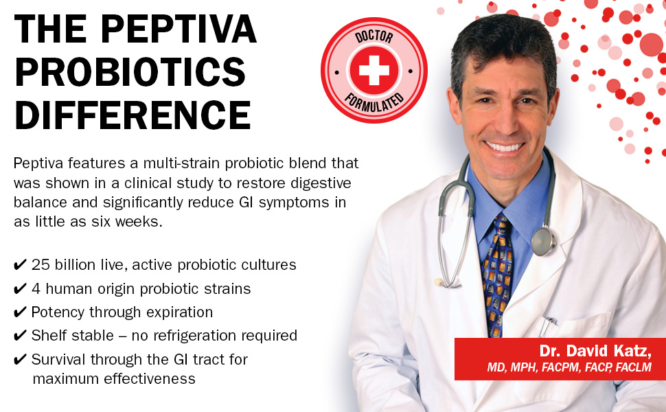 REDUCE GI SYMPTOMS IN 6 WEEKS: Peptiva features a multi-strain probiotic blend that was shown in a clinical study to restore digestive balance and significantly reduce total GI symptom score in as little as six weeks