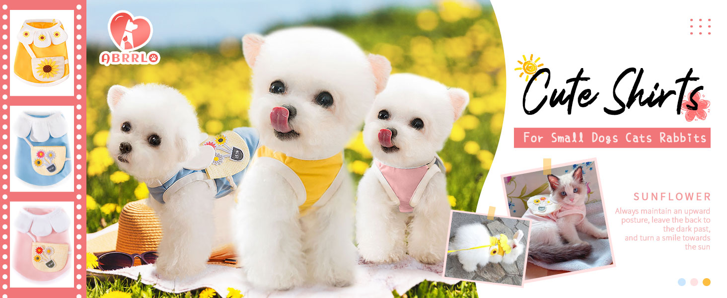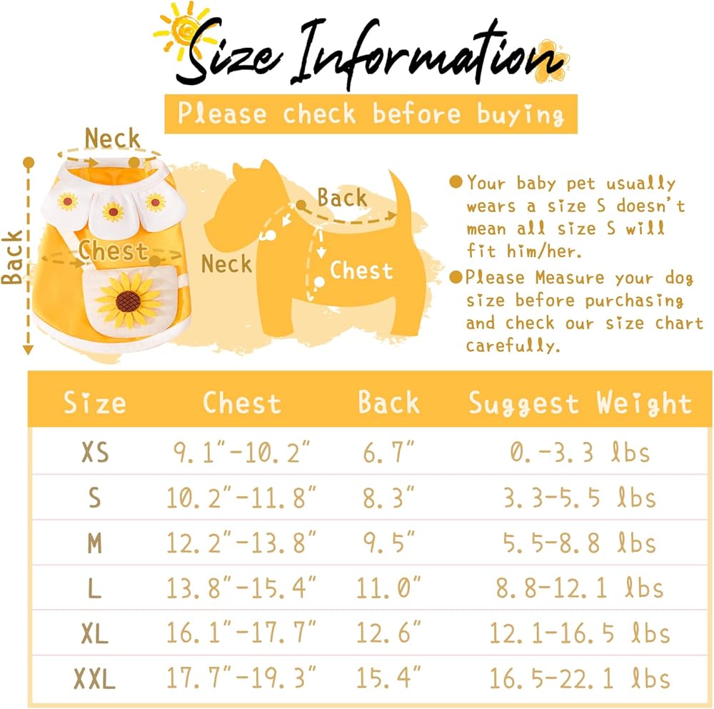 【Stylish Sunflower Dog Shirts】: This adorable dog T-shirt features a charming sunflower pattern that will make your furry friend look stylish and cute.The petal collar and sunflower design add a trendy touch to this classic puppy T-shirt,making it the perfect addition to your pet's wardrobe.