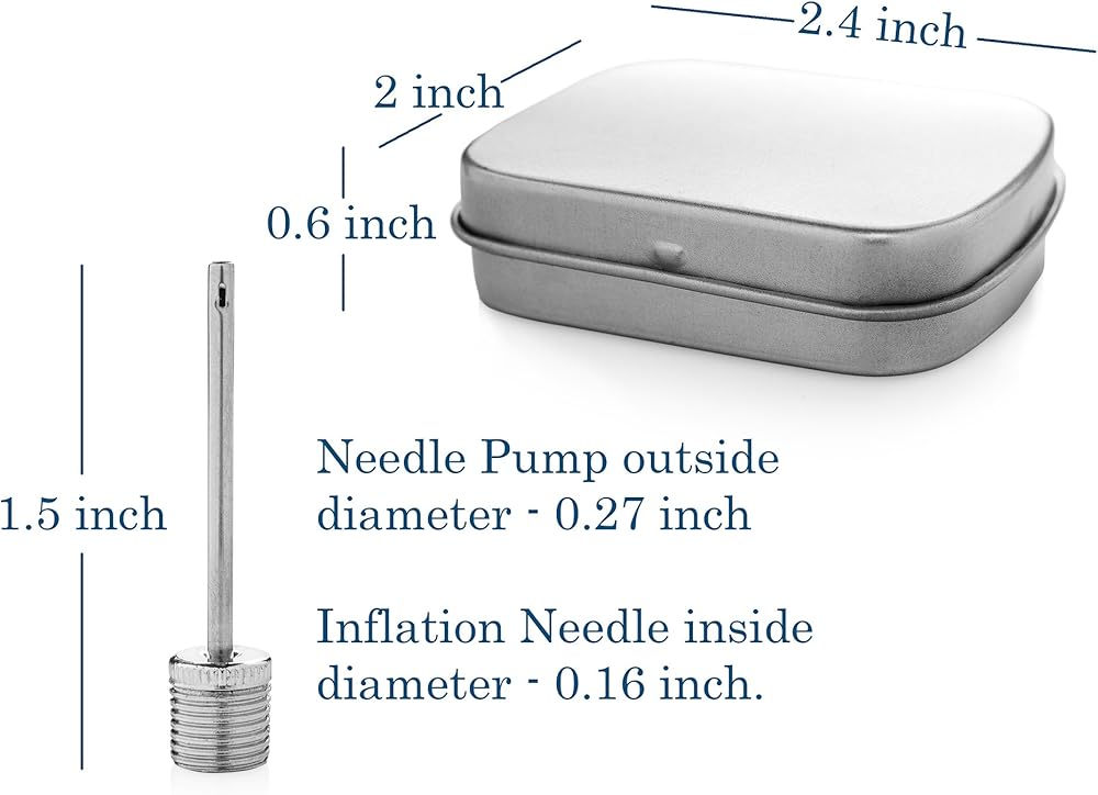 STANDARD SIZE: These Air Pump Needle packs with 12 needles measure about 1.5 inch length ,outside diameter of 0.27 inch and the ball inflation pump pins for balls inside diameter is about 0.16 in. 12 needle pieces packed in a tin storage container box for easy storage and transit