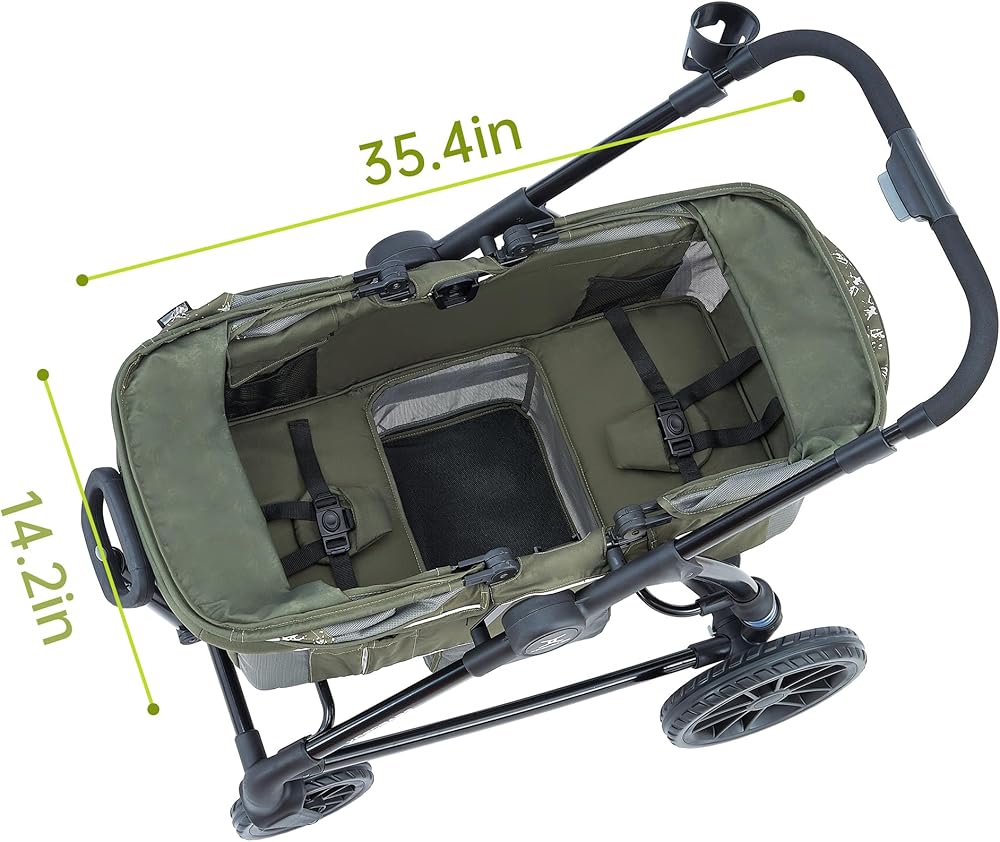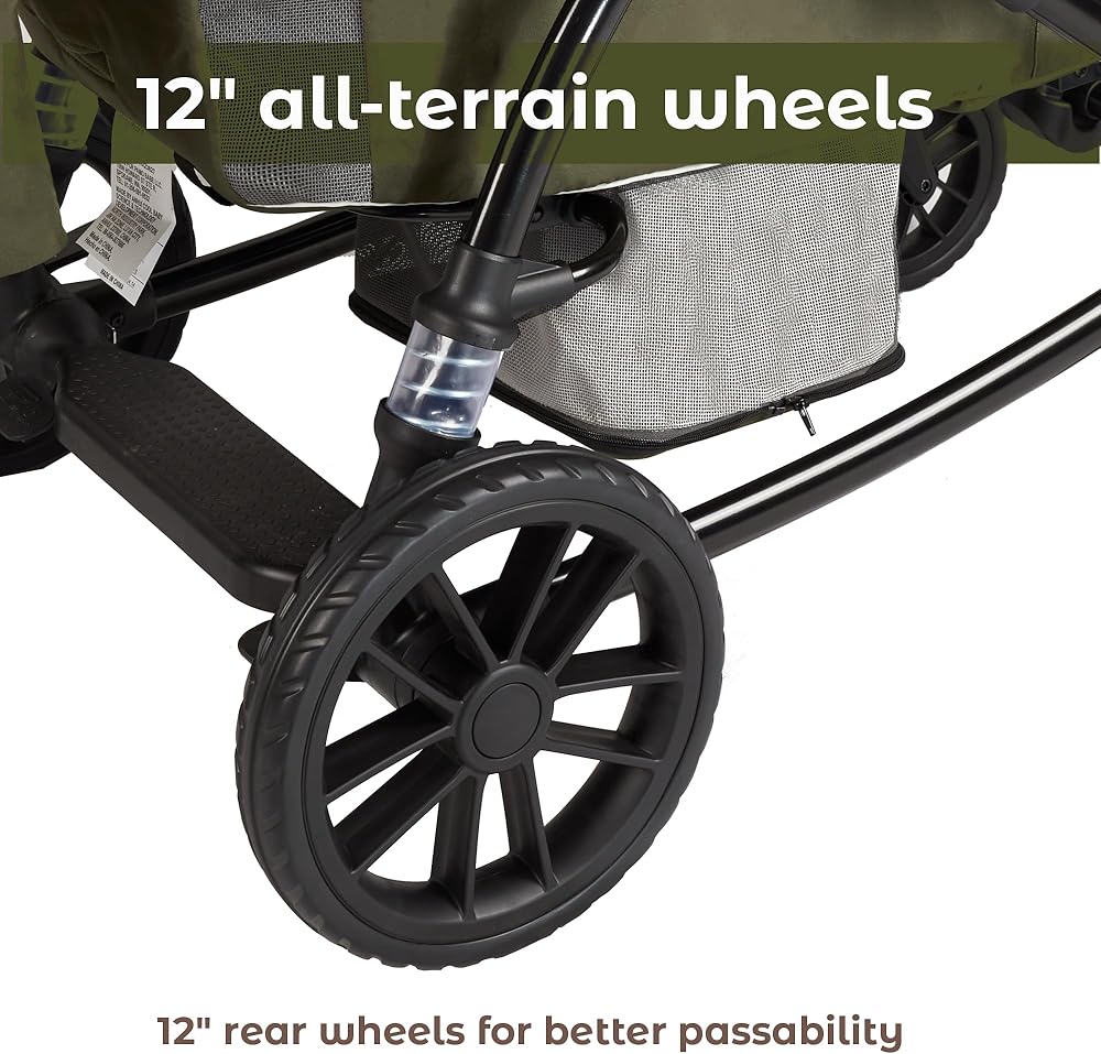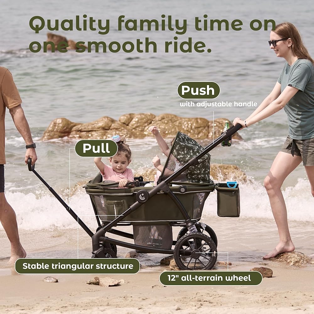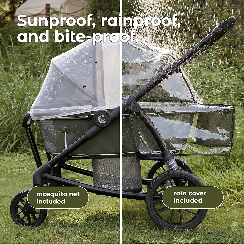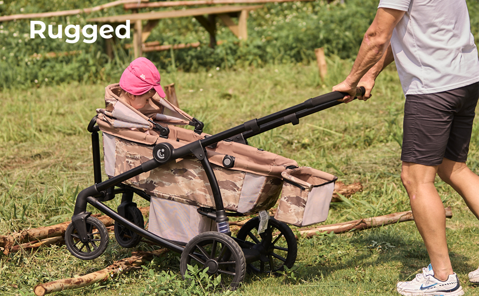 All-terrain Wheels: With 12” extra-large rear wheels and wheel suspension, the wagon stroller can navigate any terrain, from mud to rocks, in any weather, from rain to snow.
