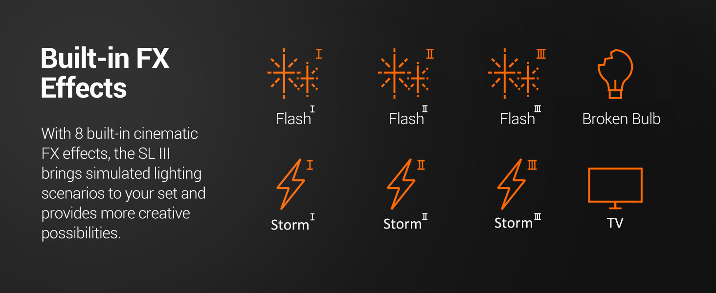【Built-in 8 FX Special Effects】 LA150D with 8 FX effects, can simulate the lighting effects of Flash1, Flash 2, Flash 3, Storm 1, Storm 2, Storm 3, TV and Broken bulb, bringing you more creative possibilities in photography and video shooting.