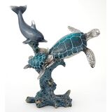 • Sea Turtle sculpture made from polystone, perfect for any beach house. Its intricate design of a turtle swimming through a coral reef makes it unique. At 9.5"x7.25"x5", it's a great size for any space. The mix of bronze, silver, and royal pacific blue colors gives it an elegant and sophisticated look