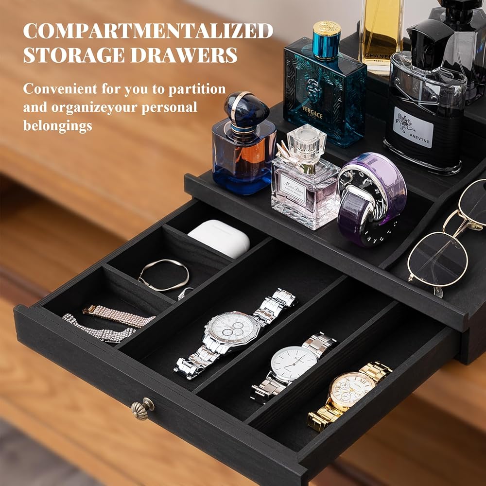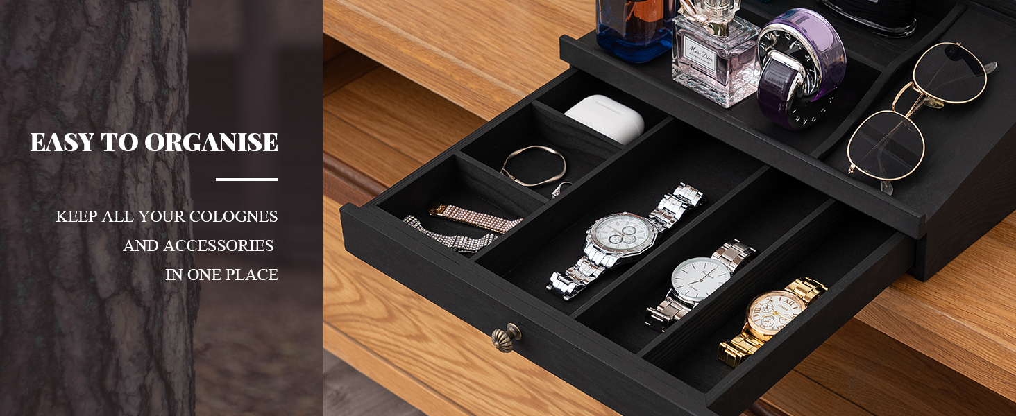 🎁【Practical Drawer Storage】The cologne holder comes with a practical drawer to organize your watches, rings, necklaces and other small items in compartments to keep your dresser neat and orderly.