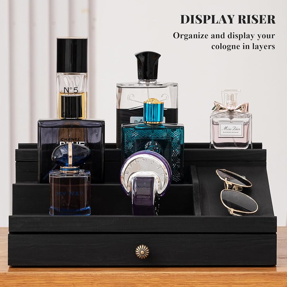 DMTINTA Wooden Cologne Organizer for Men 3 Tier of Elevated Cologne Stand Organizer with Drawer Cologne Holder with Cell Phone Stand Storage Display Risers,Great Gift for Men