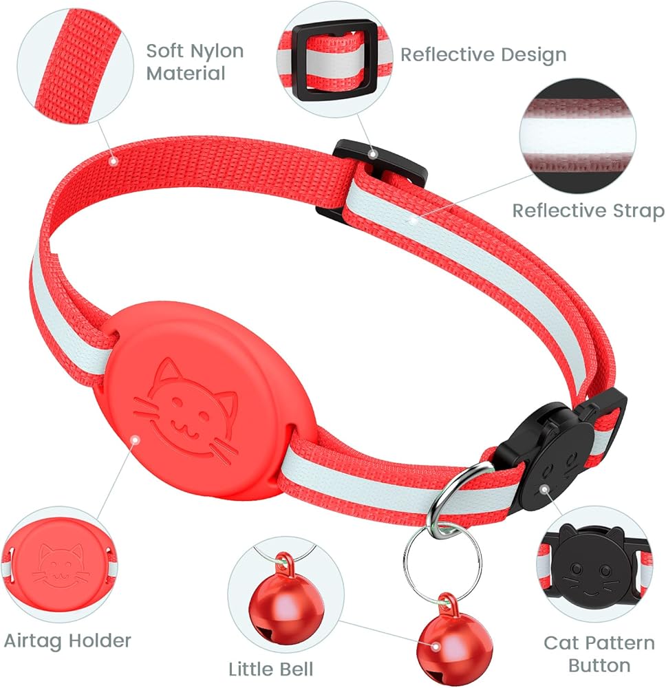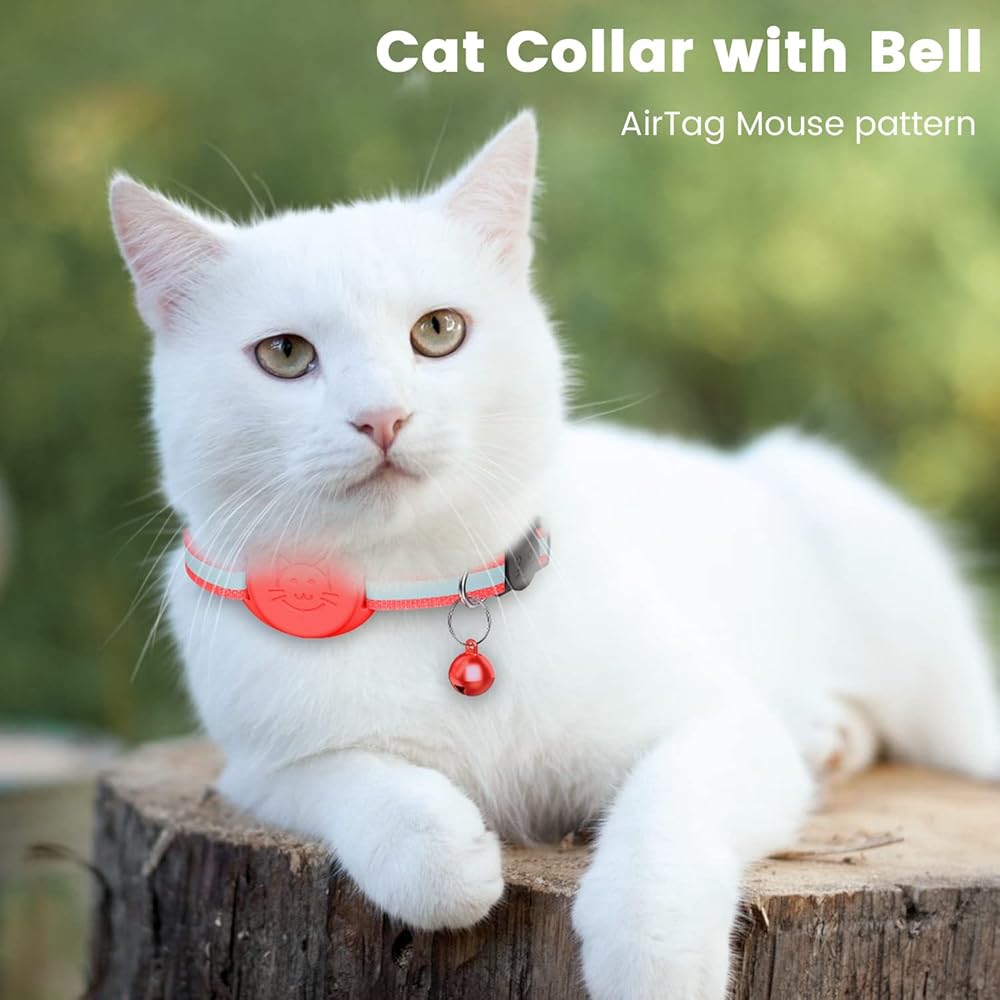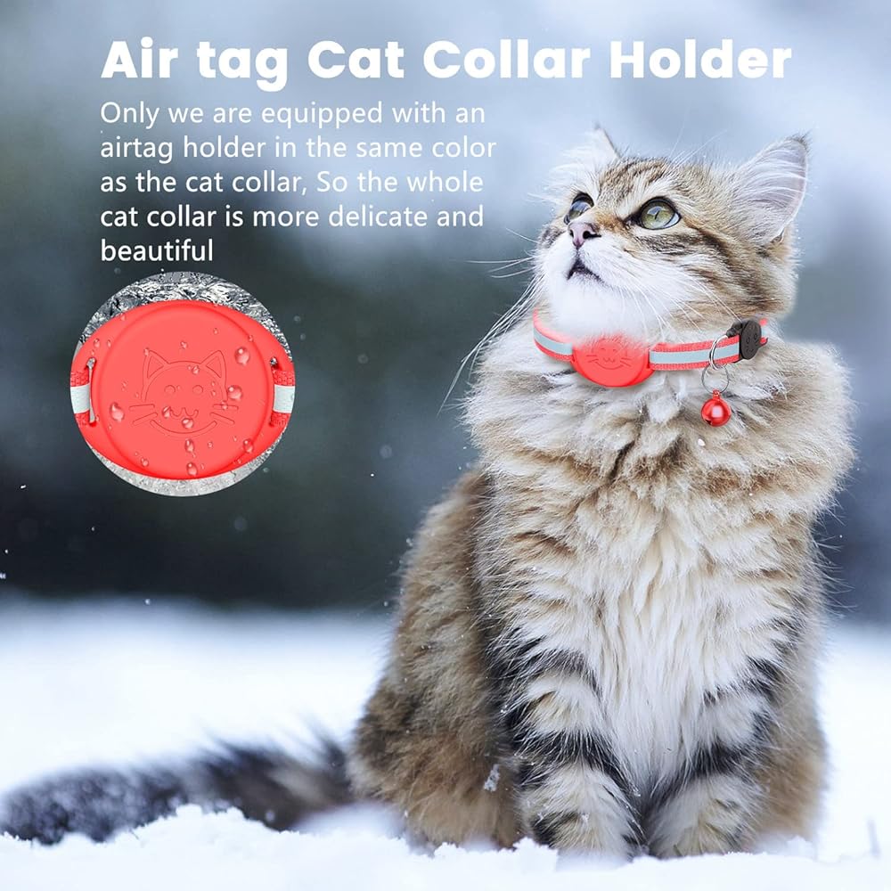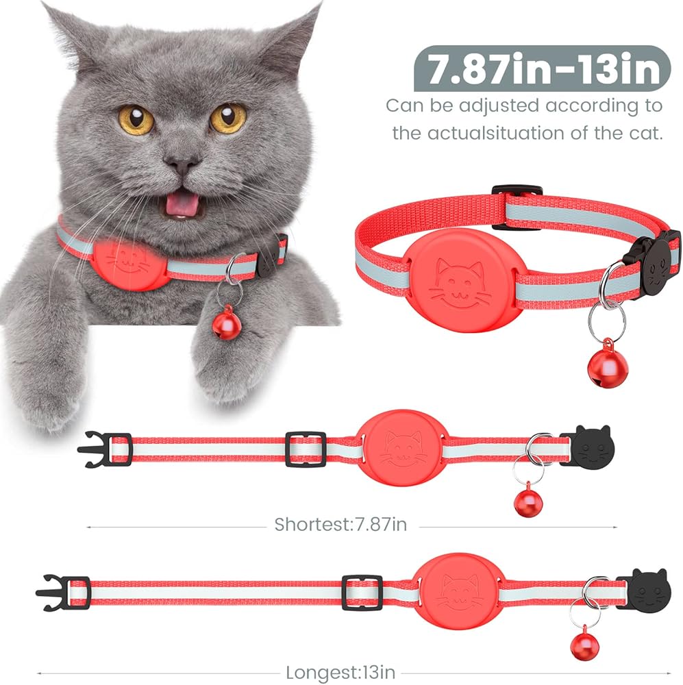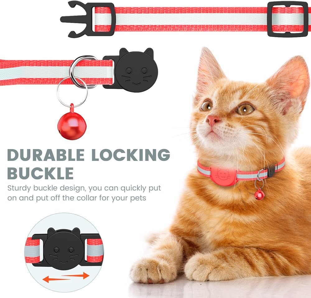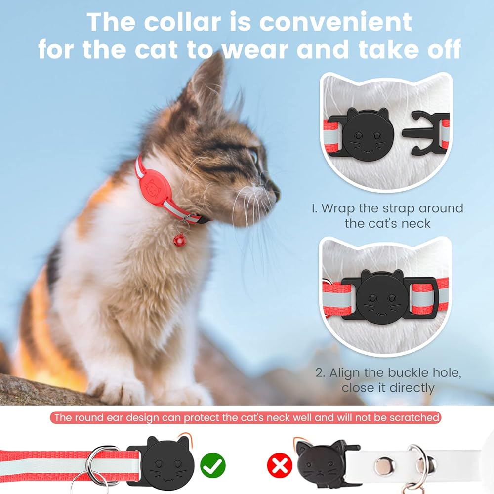 PERFECT DESIGN - Airtag cat collar adopts reflective design and breakaway safety buckle. The reflective design makes your cat easy to see in the dark, keeping you and your cat safe. With a detachable safety buckle, it is easy to take off the collar. At the same time, the cat collar is also equipped with a delicate bell, and you can also find your cat through the bell. But if your cat doesn't like bells, you can also remove the bells.