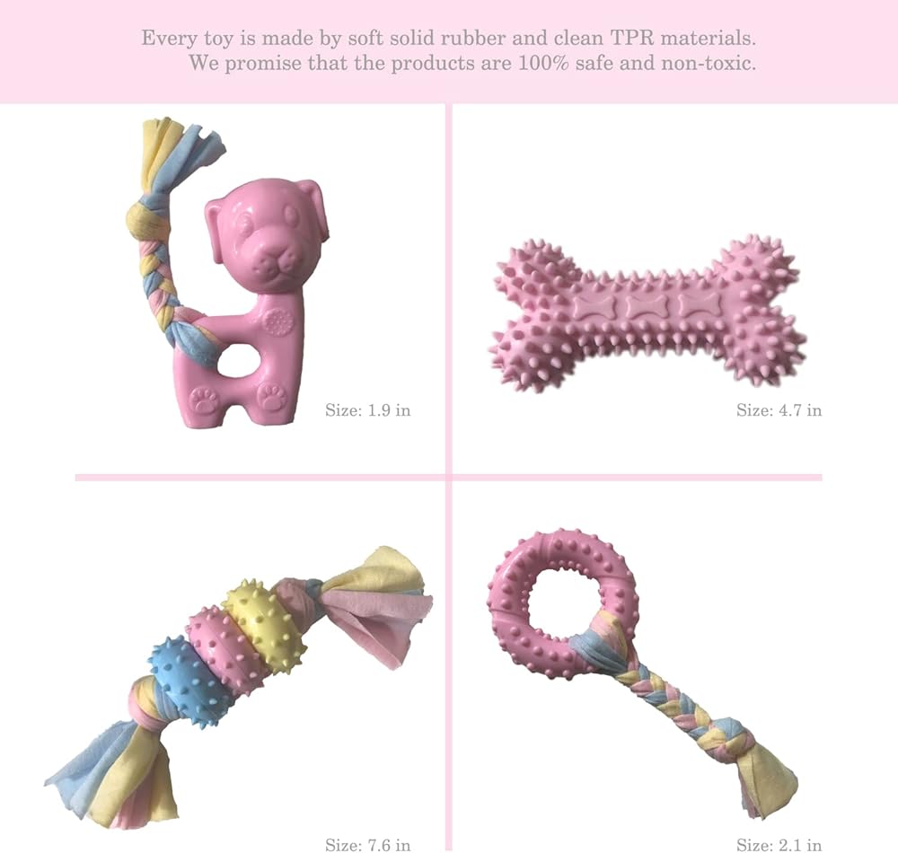 4 different shape of dow chew toys satisfies differet breed's chewing need. The package comes with dog teeth cleaning toy, dog balls for aggressive chewers,bones for chewing and dog rope toy.