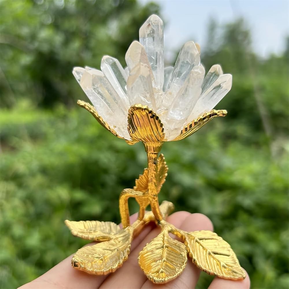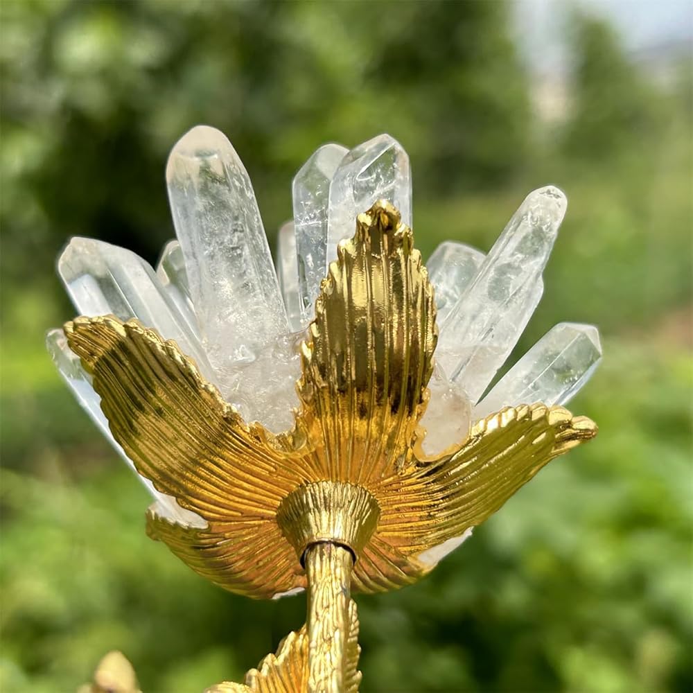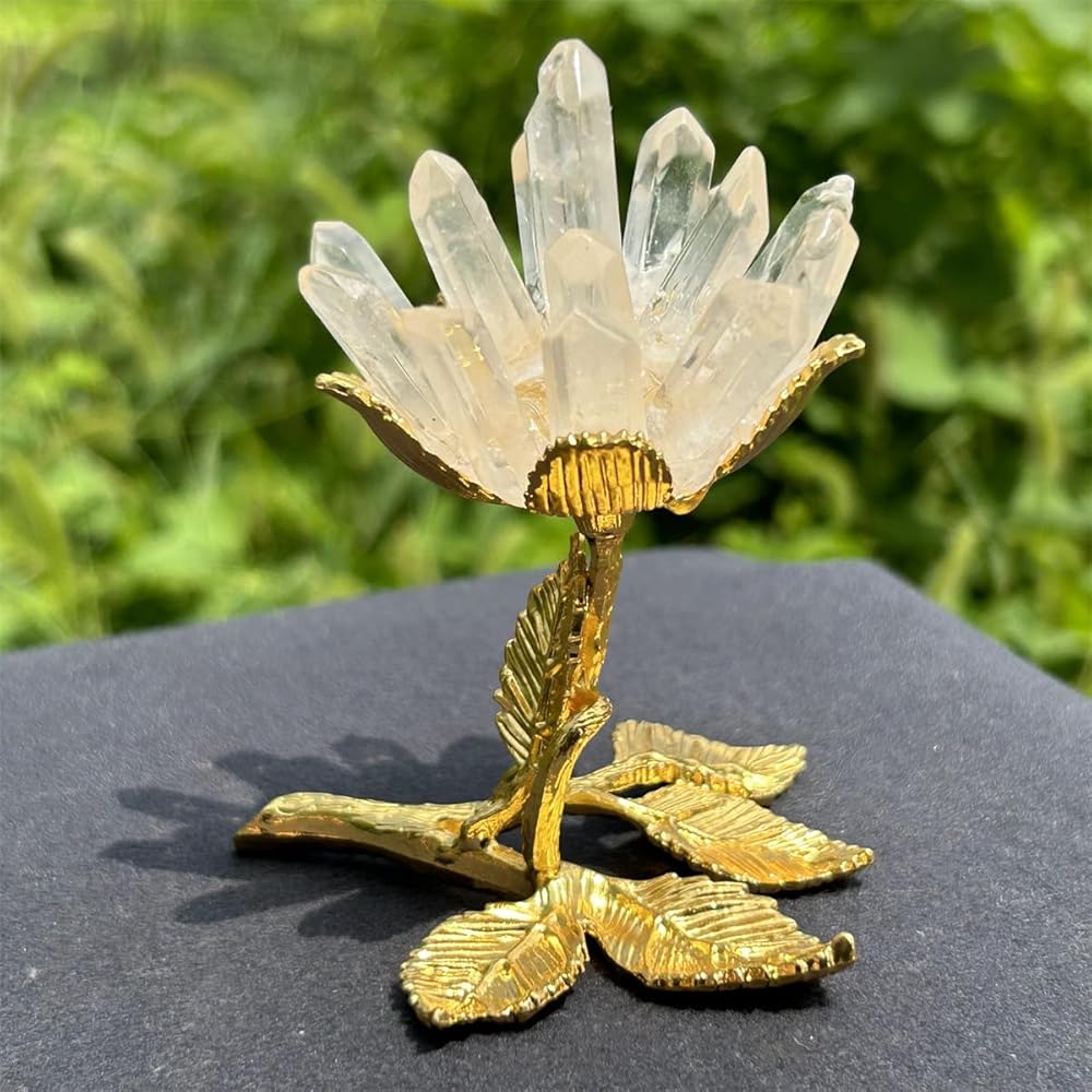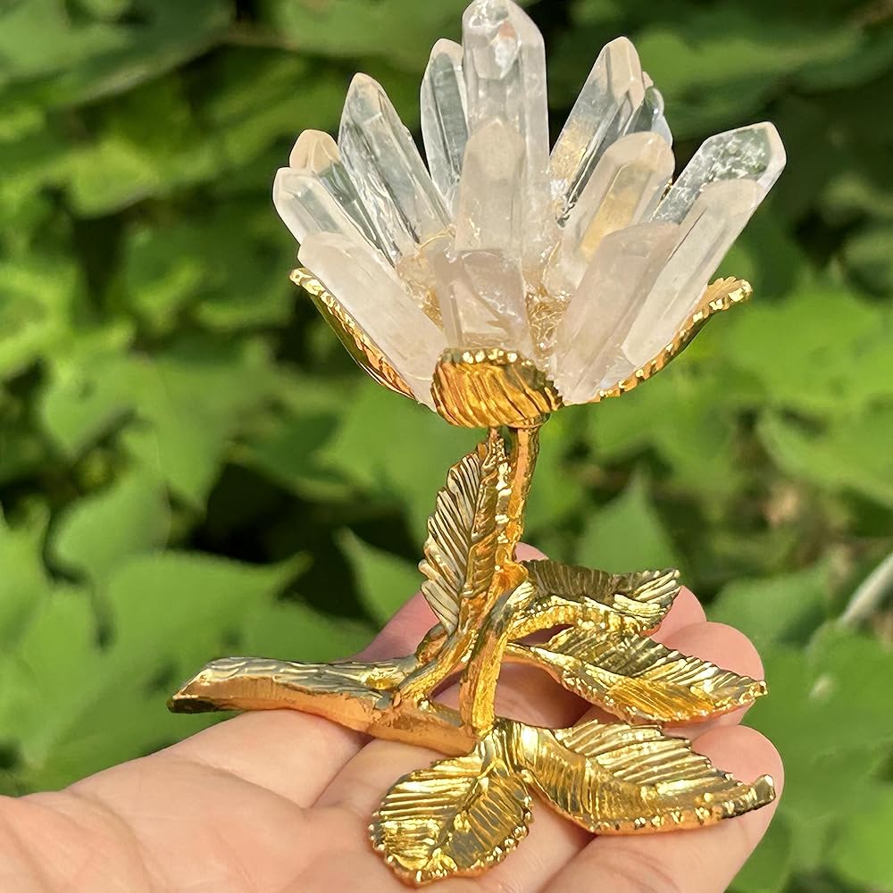 Flower part production: Natural Quartz Crystal Cluster Mineral, flower diameter And leaves is made of stainless steel color plating.