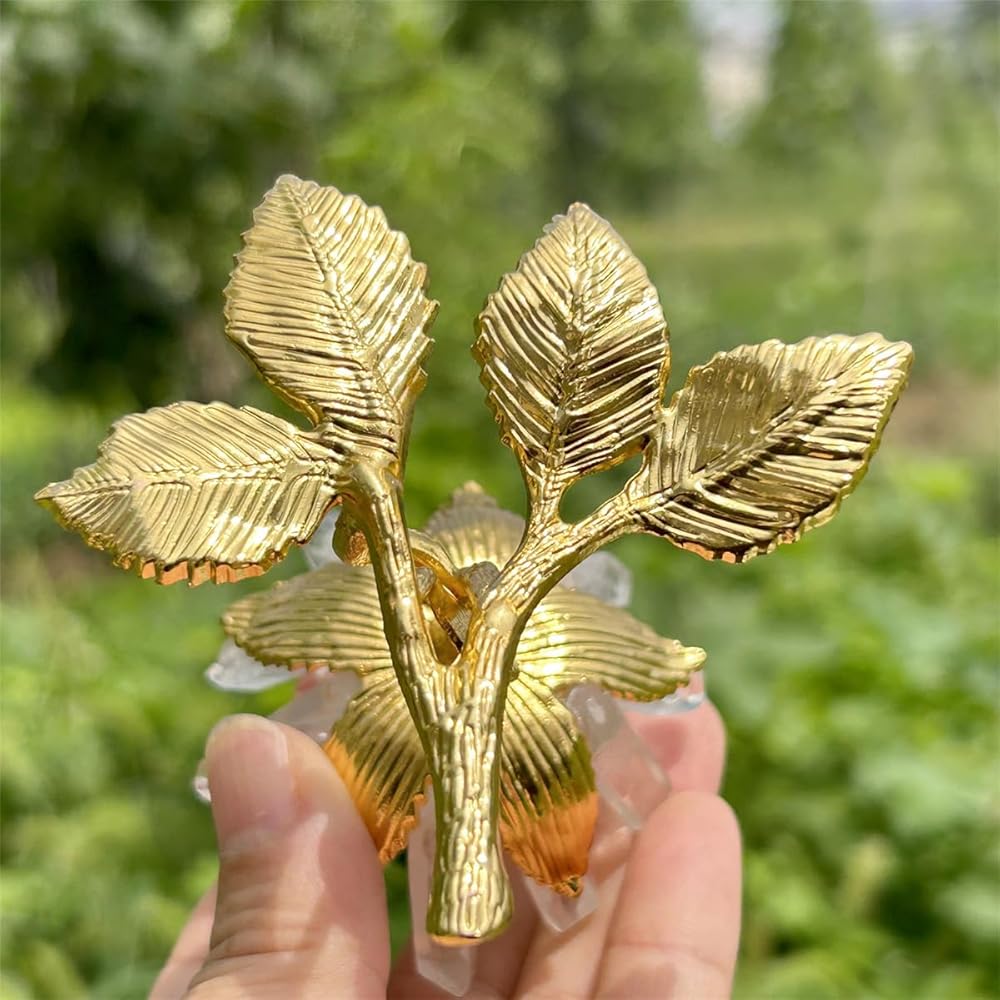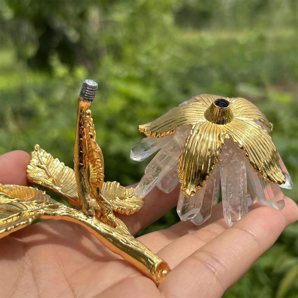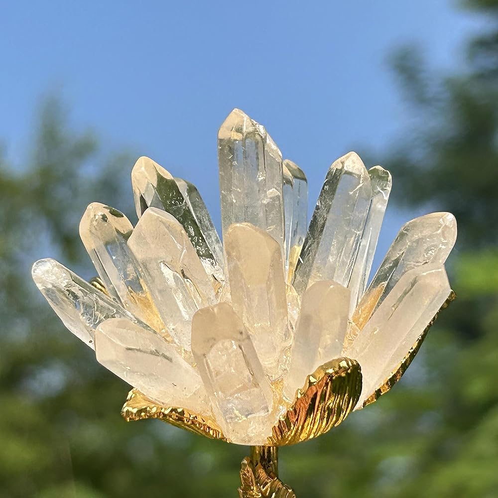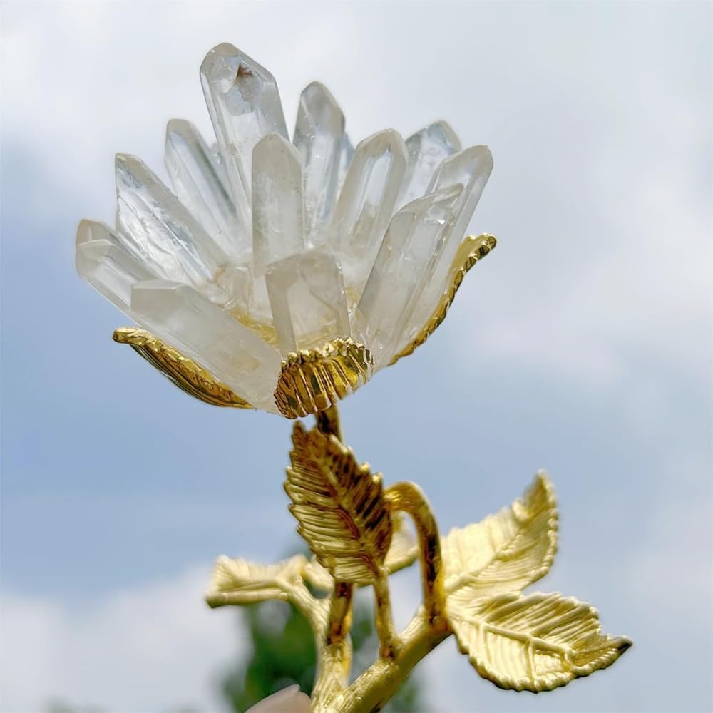 Flower part production: Natural Quartz Crystal Cluster Mineral, flower diameter And leaves is made of stainless steel color plating.