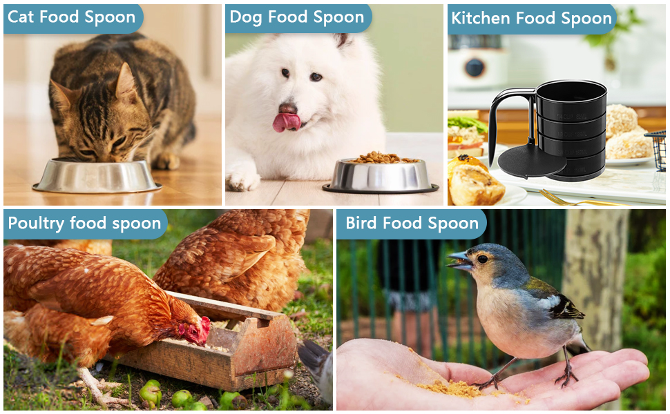 Measuring Cup Applicable: This measuring cup and spoon set is suitable for all kinds of solid particles (slightly larger) for dog, cat or bird food, and can also be used in kitchen, farm, etc. Please note that powdery particles and liquids cannot be used.