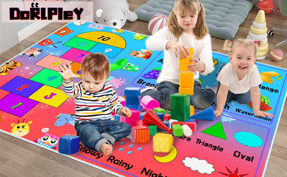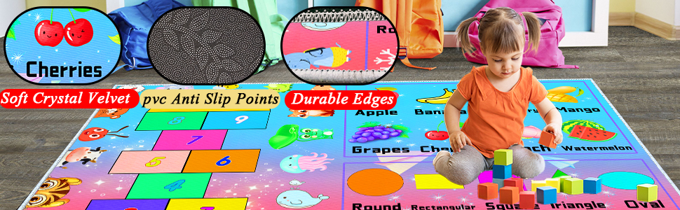 Soft Carpet: The children's play and learning carpet is made of crystal velvet. The soft material allows children to jump and play on it. The backing uses a dotted anti-slip backing to hold the carpet in place so that kids can play safely