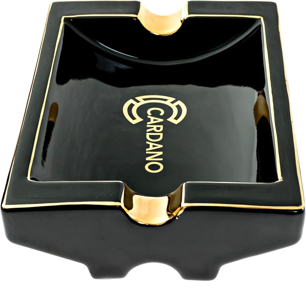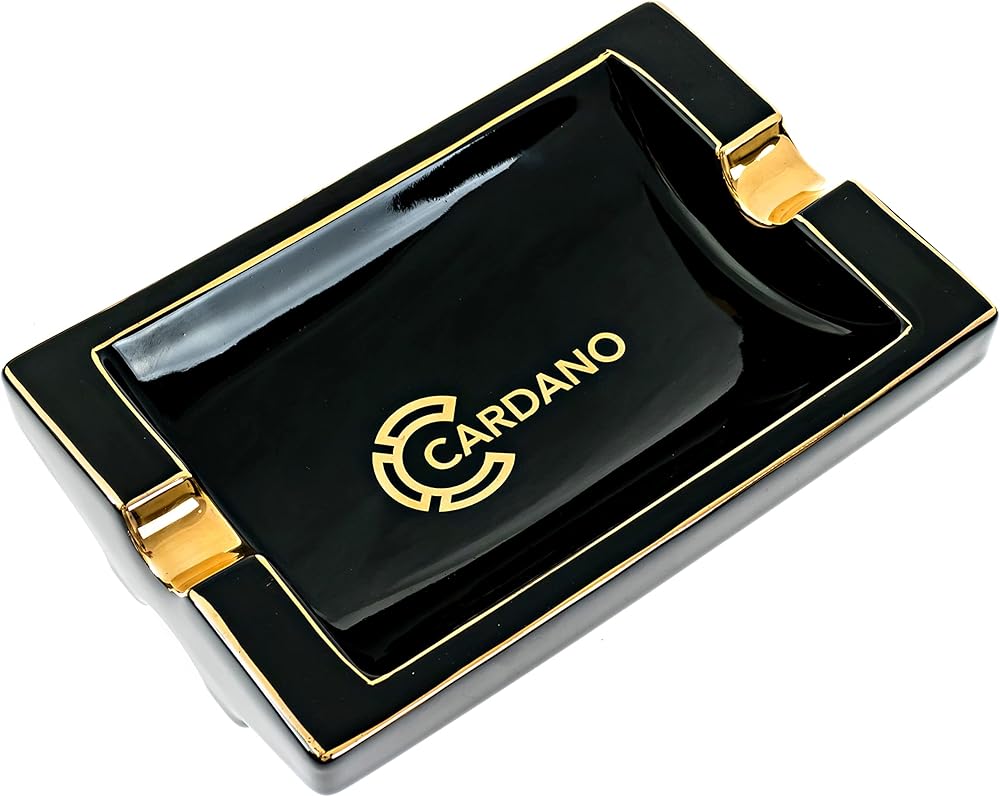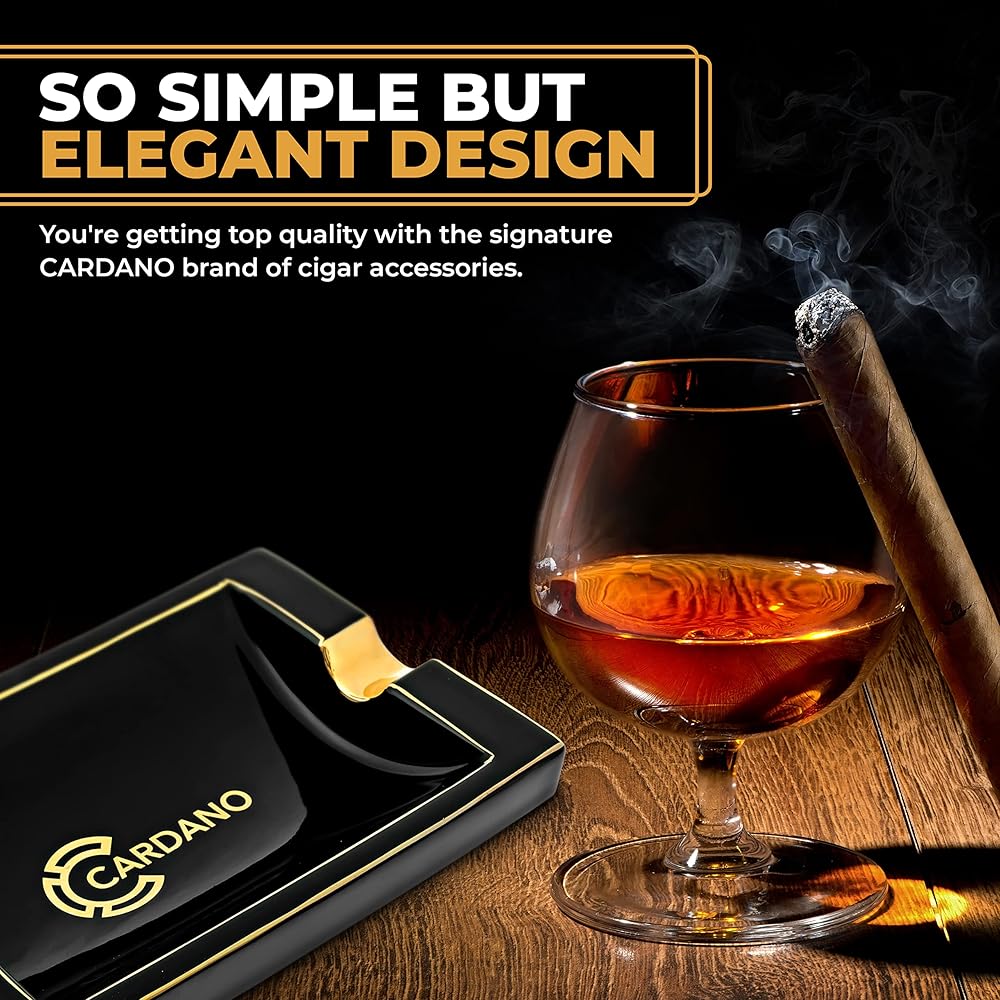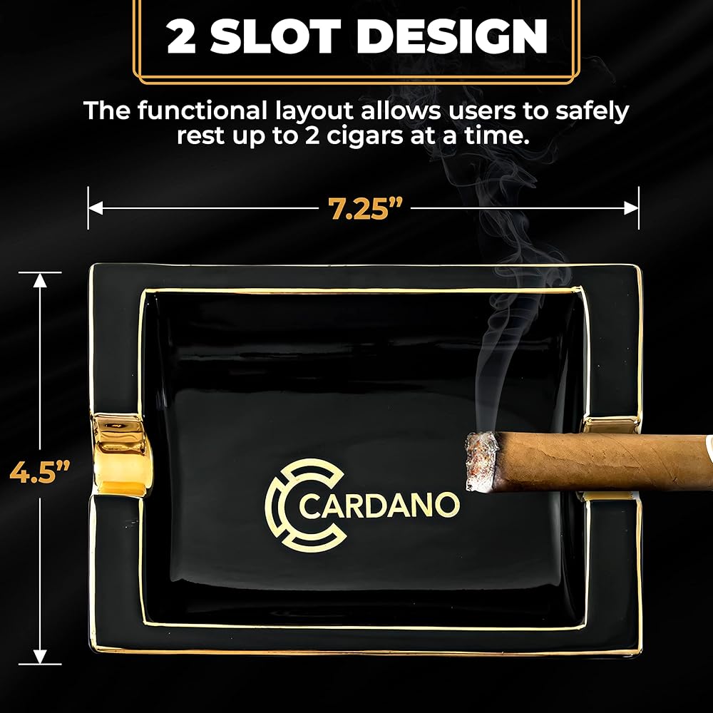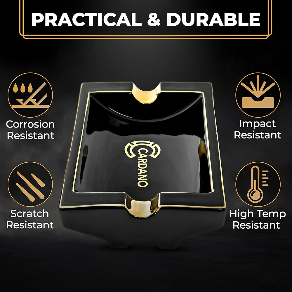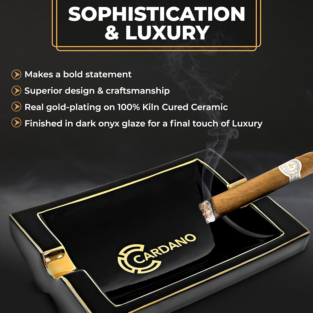 CARDANO Luxury Cigar Ashtrays – Real Gold-Plated Trim on Kiln Cured Ceramic with a Black Onyx Finish – Ash Tray for Small or Large Cigars – Indoor Outdoor Home Use for Patio Table Stand - Outside Portable Ashtray Smoking Accessories Gift Set for Men