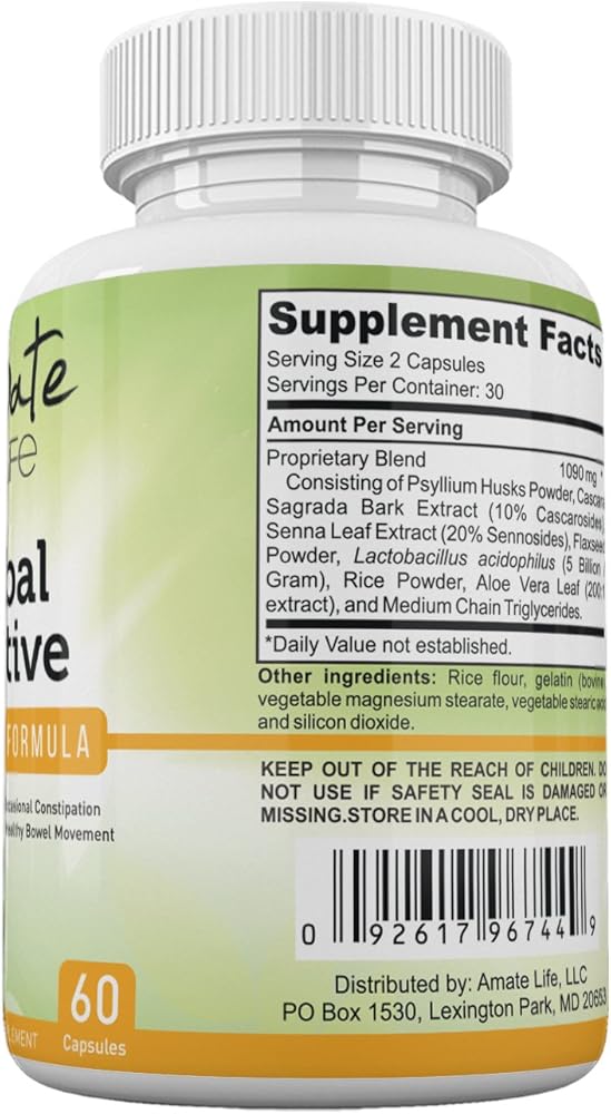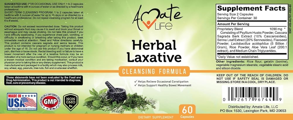 Amate Life Herbal Laxative Cleansing Formula Laxative Capsules Help with Occasional Constipation Promotes Regularity Probiotics Source Digestive System Health Non-GMO 60 Capsules