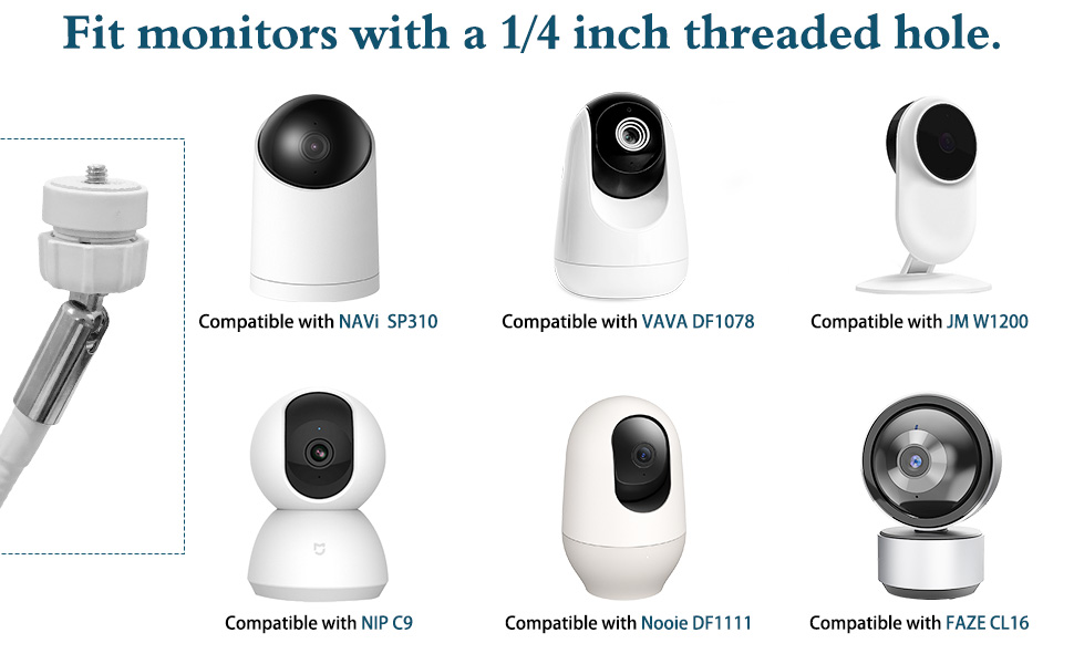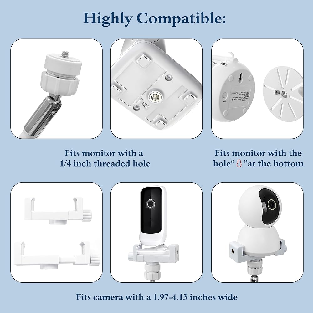 【Widely Compatible】: Adjustbale clamp of the baby monitor stand can fit for monitors with 1.97-4.13'' wide straight body or base. 1/4 Screw Socket compatible with Eufy 720p Video, Hellobaby HB65, Eufy Spaceview Pro, Owlet Cam 2, VTech VM901 and any other monitors with 1/4'' threaded connection. The universal chassis support compatible with Infant Optics DXR-8, ANMEATE SM935E Baby Motorola and any other monitors with a calabash hole at the bottom.