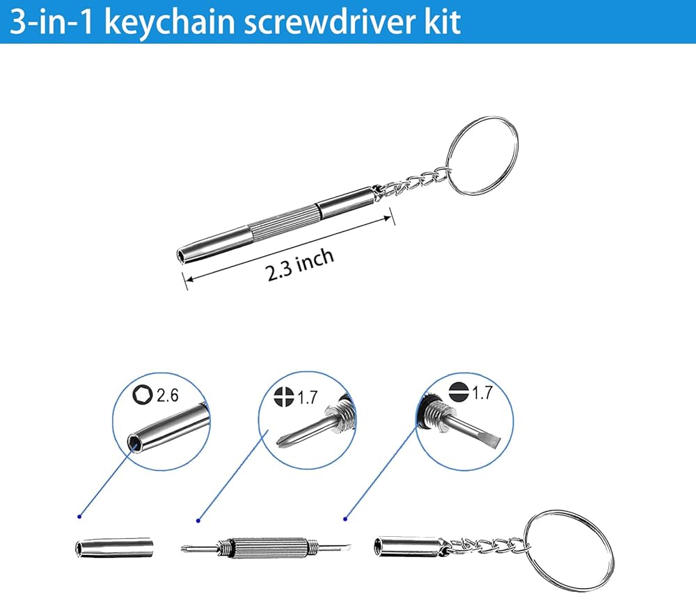 【The Keychain Screwdriver】It comes in three modes:1.7mm Phillips, 1.7mm flat, 2.5mm nut driver. It is specially designed for eyeglasses, watches, small clocks, and other small electronics.