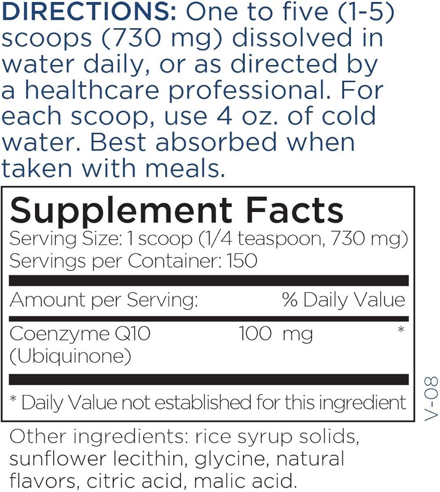 CoEnzyme Q10 is a powerful antioxidant that has been shown to be beneficial for heart health. Our powder We combine CoQ10 with rice syrup solids, lecithin (soy), glycine, natural flavors, citric acid and malic acid to create a unique water-dispersable powder with a pleasant orange flavor. A pilot study showed faster elevation of blood levels of our CoQ10 Powder compared to tablets, capsules or softgels. Using the provided scoop, this product contains 150 orange flavored servings with 100 mg of CoQ10 per serving.*