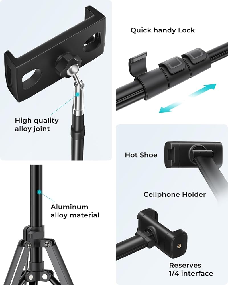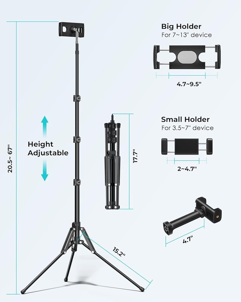 【Adjustable 67'' Tripod Stand】This tripod stand offers an adjustable height range from 20" to 67" (52-170 cm). The enhanced stability provided by the upgraded aluminum alloy tripod base prevents tipping, making it perfect for photographers, vloggers, YouTubers, family gatherings, and live streaming.