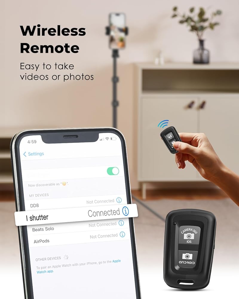 【2.4G Wireless Remote】: The tripod comes with a 2.4G wireless remote that is compatible with smartphones (IOS 6.0+ and Android 4.2.2+) and cameras, operating within an effective range of 33 ft / 10 m. This allows for seamless connectivity and rapid response during filming. You can initiate easy selfies, group photos, filming, and vlogging without the need to physically touch your cellphone.