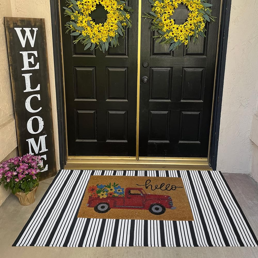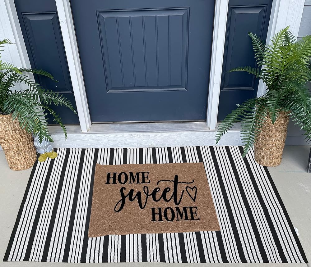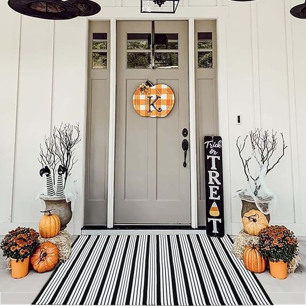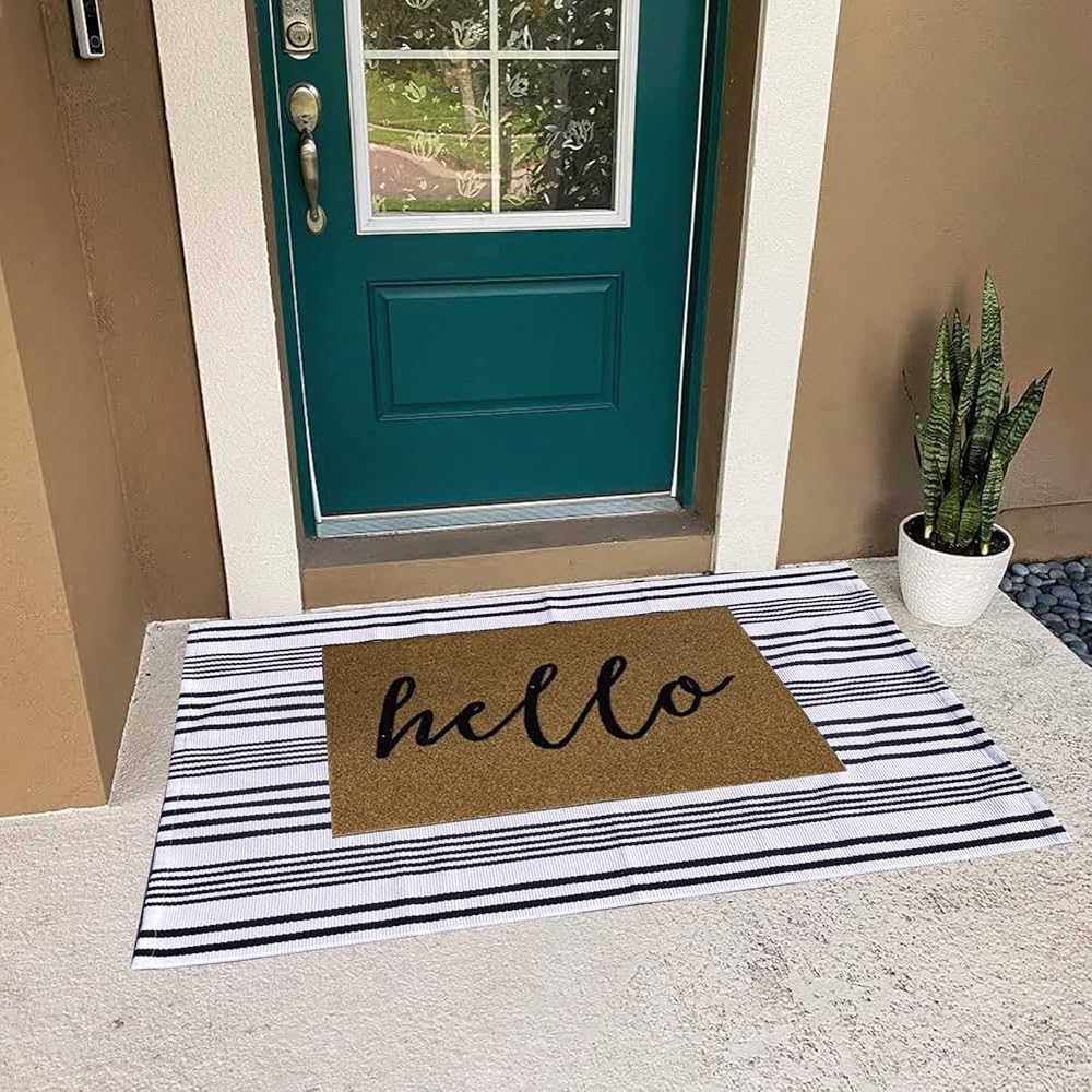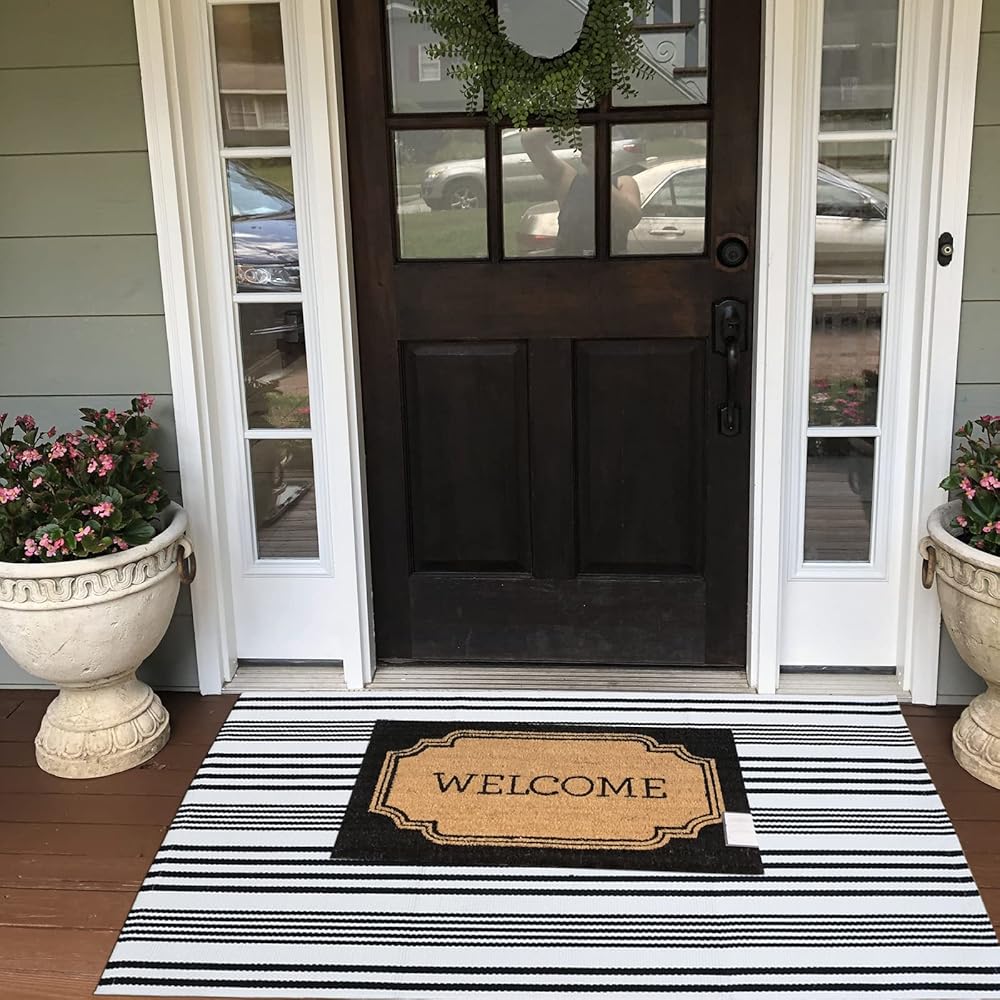 ⭐CUSTOMIZED SIZE for HELLO DOORMAT:Customized size for freshening up your porch decor by layering this black and white striped outdoor rug with a hello doormat; Your front door will be Instagram ready!