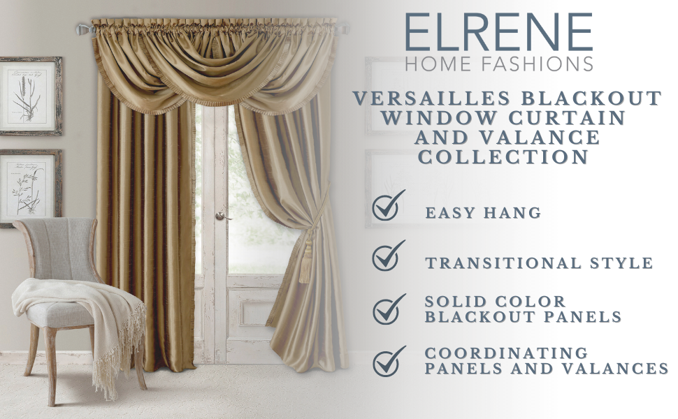 Elrene Home Fashions provides beautifully fashionable home decor to suit any decorating taste. Capture a luxurious bohemian or royal look with an Elrene Home Fashions Versailles Room-Darkening Waterfall Window Valance for your bedroom, living room, kitchen, or bathroom. Your order includes 1 window valance with rod pocket tabs. Each single-pleated valance has a faux-silk texture and comes in a variety of beautiful solid colors to add luxury, class, and elegance to windows throughout your home. Feel like you're in a French palace in any room while also getting room-darkening perks with the valance's draping waterfall design. Layer 3-4 valances and up to 4 panels from the Versailles collection to create a complete window look. (Each sold separately.)