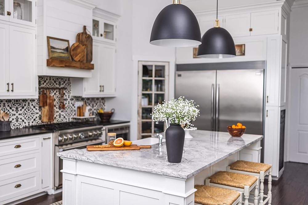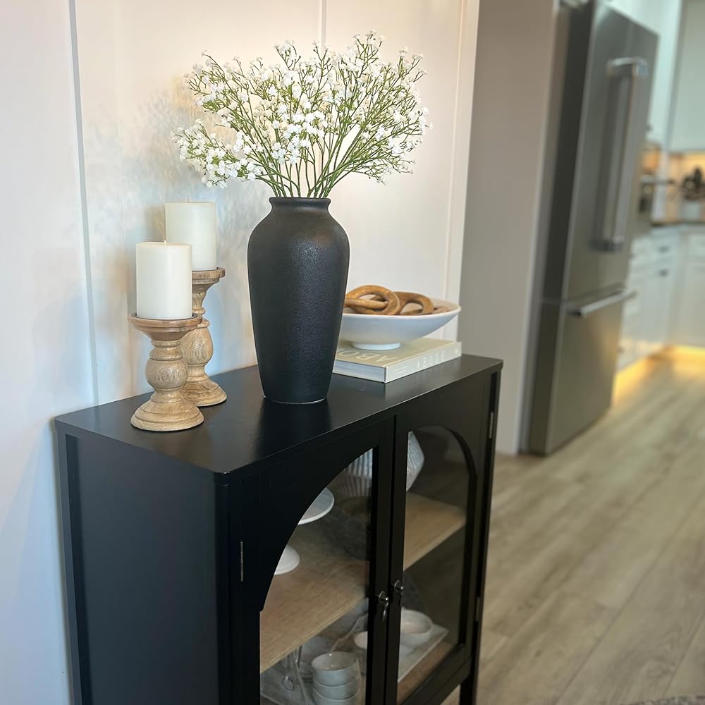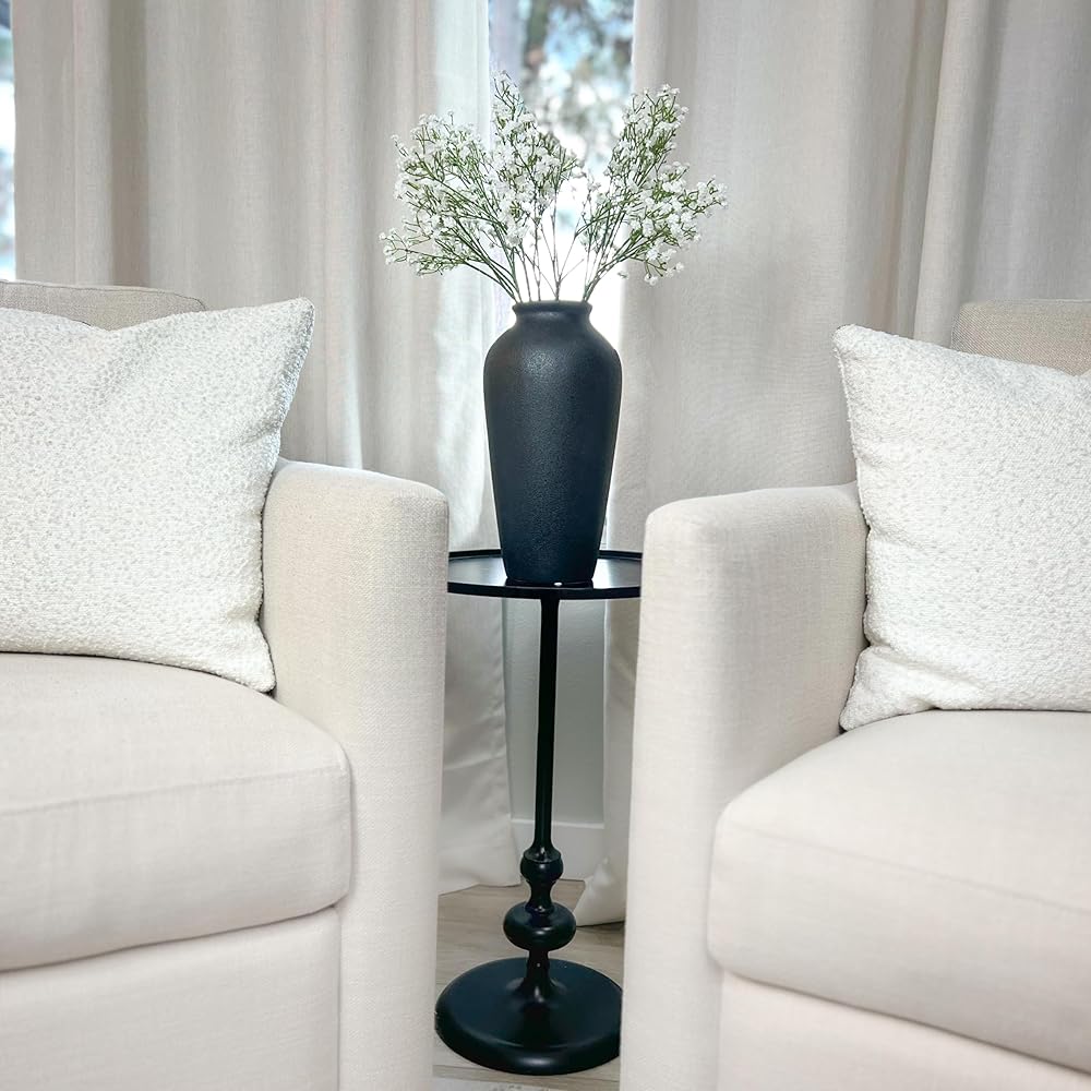 Laurel&Vine 12" Tall Black Ceramic Vase, Speckled Textured Minimalist, with 15 Stems of 22" Faux Artificial White Babys Breath, Farmhouse Console Centerpiece Decor, Real Touch Fake Flowers in Vase