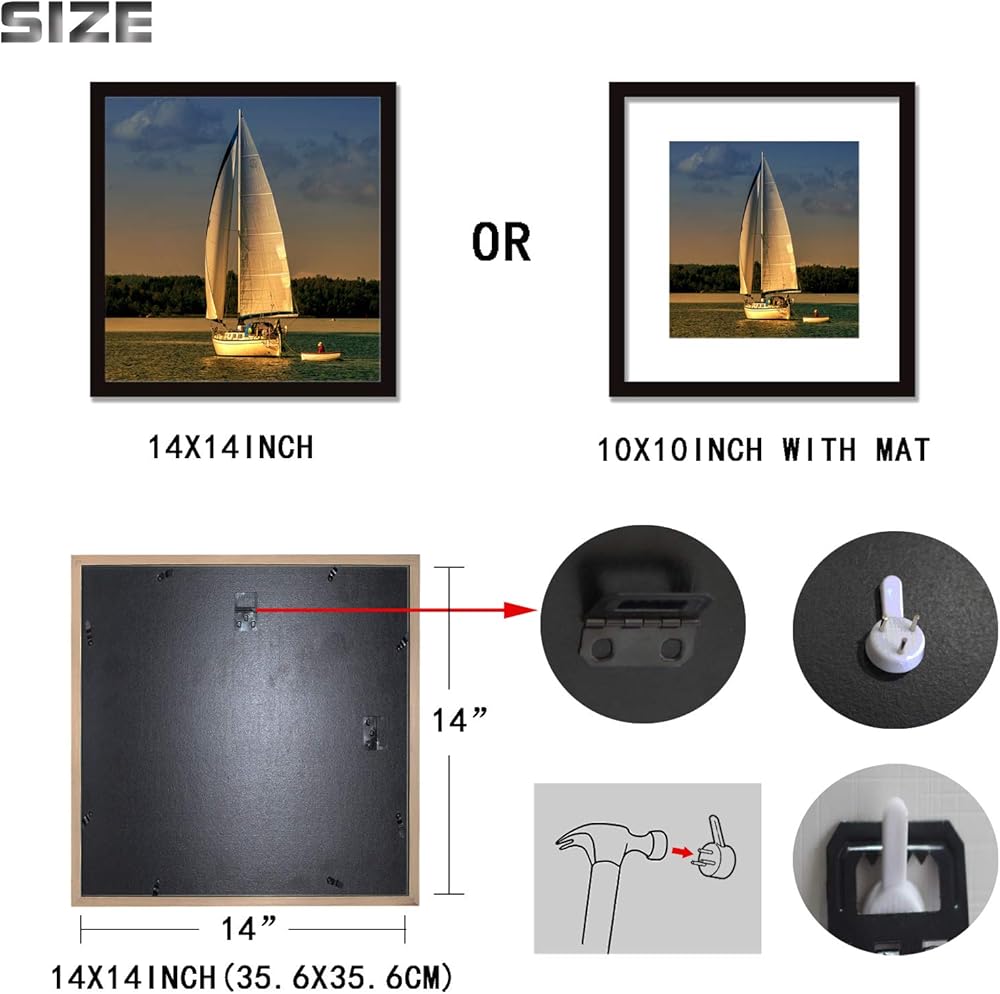 Typical use: It is a classic picture frame, which perfectly displays your pictures, photos, posters, paintings, certificates, it can be hung on your wall horizontally or vertically. Materials: The frame is made of durable solid wood (pine) frame and Plexiglas cover (not glass), Plexiglas displays high definition like glass and more secure, the frame can be mounted anywhere, you don't need to worry about damages due to accidental glass breakage. SIZE: Can hold up to a 18x18"(45.7*45.7cm) picture, or 14x14"(35x35cm) with white mat Set up: Complete easily with a hammer, pre-installed horizontal or vertical hanging hooks, and specially designed white nails we have provided. Package: We inspect each frame carefully and package with bubble wrap, if it is unexpectedly damaged in shipping, we will guarantee for refund, Many thanks for your trust and support