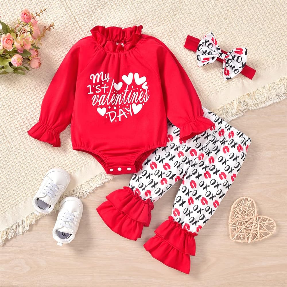 Design:Baby girl Valentines Day outfits. My 1st Valentines Day Romper+ Flare Pants+Headband Decoration Design,make your Baby more Fashion.