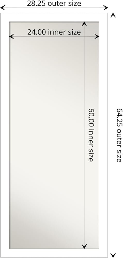 MIRROR DETAILS: This mirror features premium glass for a clear, undistorted image and has a non-beveled surface to maximize the viewing area. The overall size of this full-length mirror measures 28.5 x 64.5 inches, including the frame. Its reflective area measures 24 x 60 inches.