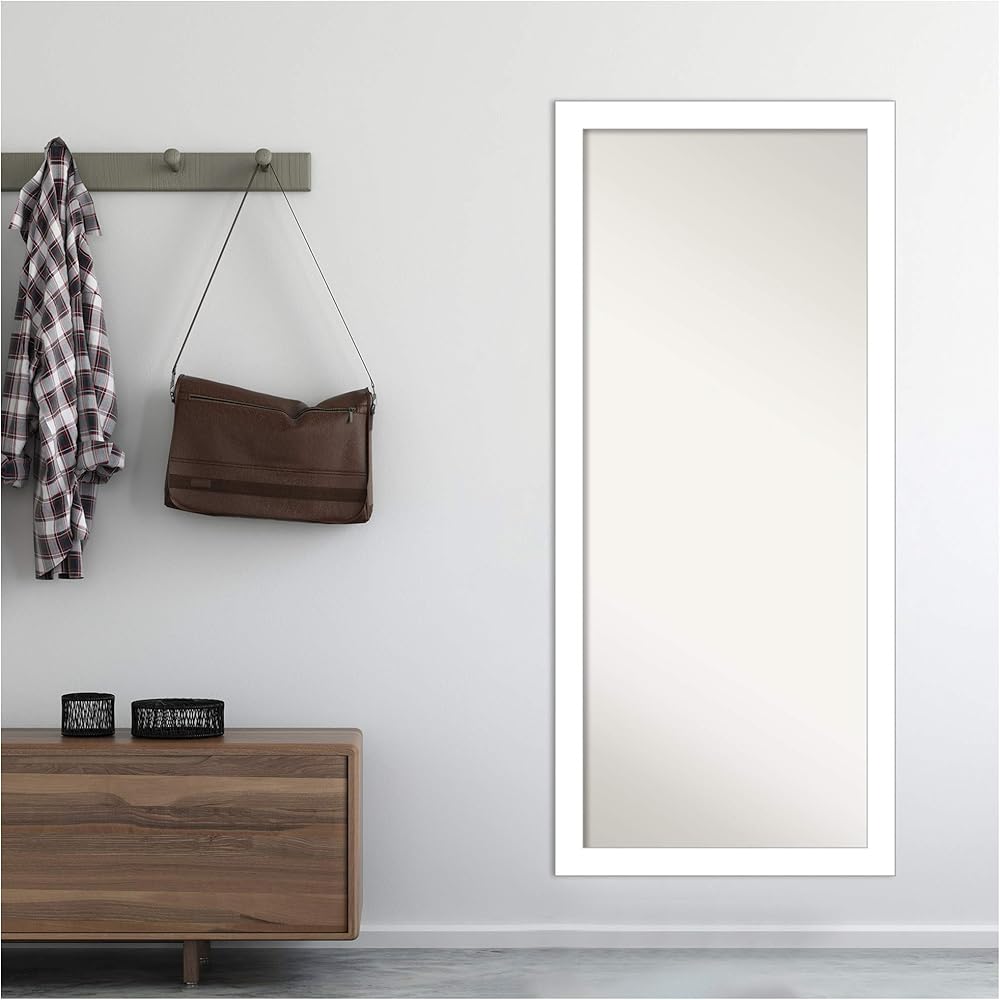 PRODUCT: Amanti Art Non-Beveled Full-Length Mirror; FRAME: Mosaic White 2.45"; FRAME FINISH: Satin; FRAME COLOR: White; OUTER SIZE: 28.5 x 64.5 inches. The Mosaic White frame features a white frame with a textured, mosaic-style tiling pattern that covers the level surface. The outer edge is a smooth, satin finish white. Give your home or office the finishing touch with this framed full-length mirror. Individually made using traditional custom framing techniques, it has the quality you would expect from your local frame shop. It holds its value with premium finishing that can be appreciated up close. For placement on the floor, lean the mirror at a stable angle against the wall. We also give you everything you need if you want to hang your wall-mounted mirror without the hardware showing. Because of our attention to detail and focus on artistry, architects, interior designers, and homeowners alike choose this mirror to create beautiful living spaces.