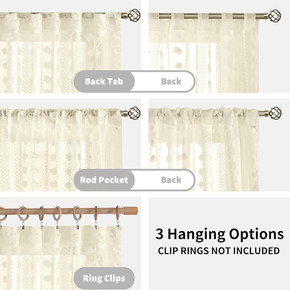 Improve your home decor with our elegant white sheer curtains set. You'll receive 2 panels, each measuring 52 inches wide by 63 inches long. Our pom pom curtains can be styled in either rod pocket or back tab, and feature a convenient 3-inch pocket on top to fit most curtain rods. They're also a breeze to install and slide open and closed.