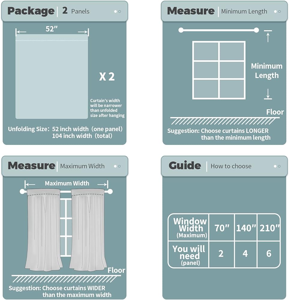 Please note that our curtains are measured by flat width for each panel before installation. The actual coverage width may be less due to hanging and gathering. For optimal coverage, we recommend choosing a total curtain flat width that is at least 1.5-2 times wider than your window. We advise measuring your window size prior to purchasing to ensure the perfect fit.