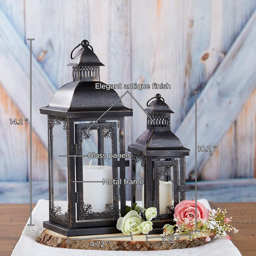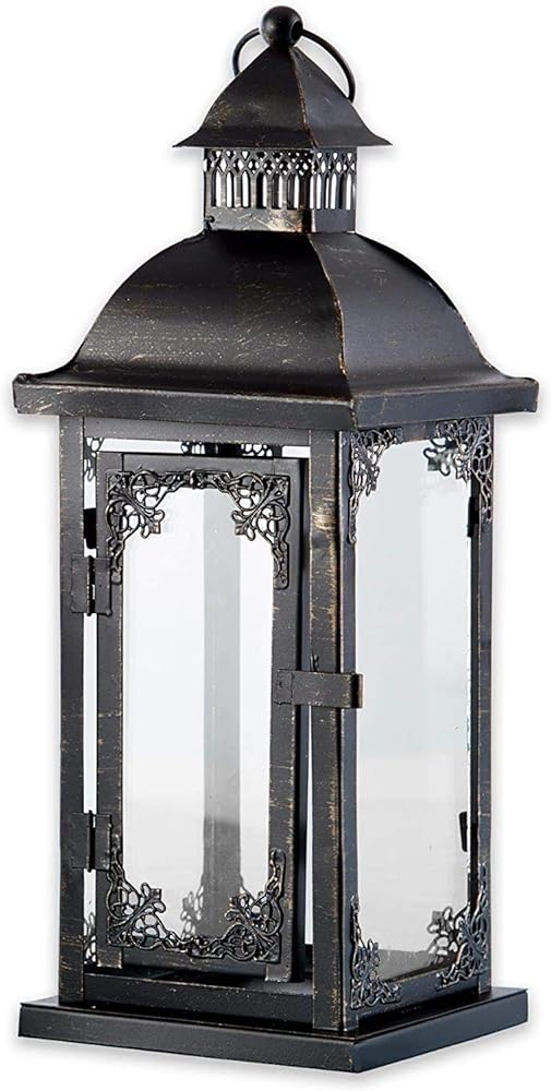 Kate Aspen's medium Antique Black Ornate Lantern is just the decorative lantern you need for your beach wedding. When searching for beach décor, you want items that are easy to transport and not too fragile. This well-made candle lantern is exactly what you need when you and your Hubby will be saying your vows across the water. We enjoy bringing new and unique pieces to you, and this lantern is just what you need. For those of you hosting a lovely wedding in the country, these lanterns will look wonderful for an outdoor reception as well. Use them for wedding aisle décor and line them up down the aisle. Fill them with lights so your path will be illuminated while you walk down the aisle. These are a great buy for the price and we strongly recommend them. Get it today and start your wedding planning asap! Features and Facts: Sold individually. Black metal lantern with vintage distressed details. Sides have glass windows with ornate details in the corners. Top has a d-ring handle. Candle not included. Without handle: 4. 72" w x 4. 72" d x 12. 8" h With handle: 4. 72" w x 4. 72" d x 14. 2" h Packaged: 5. 12" w x 5. 12" d x 13. 23" h