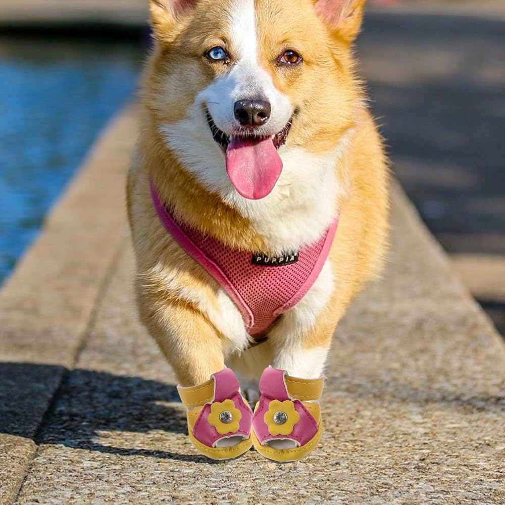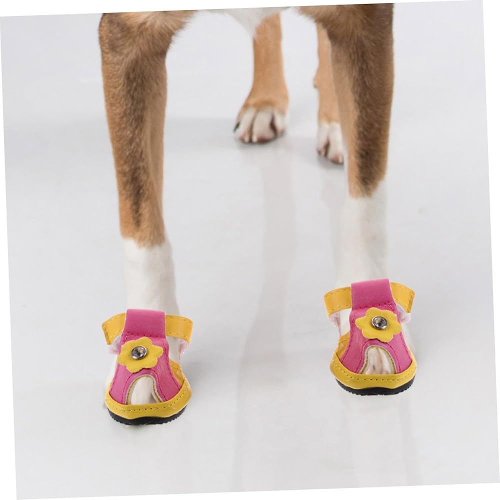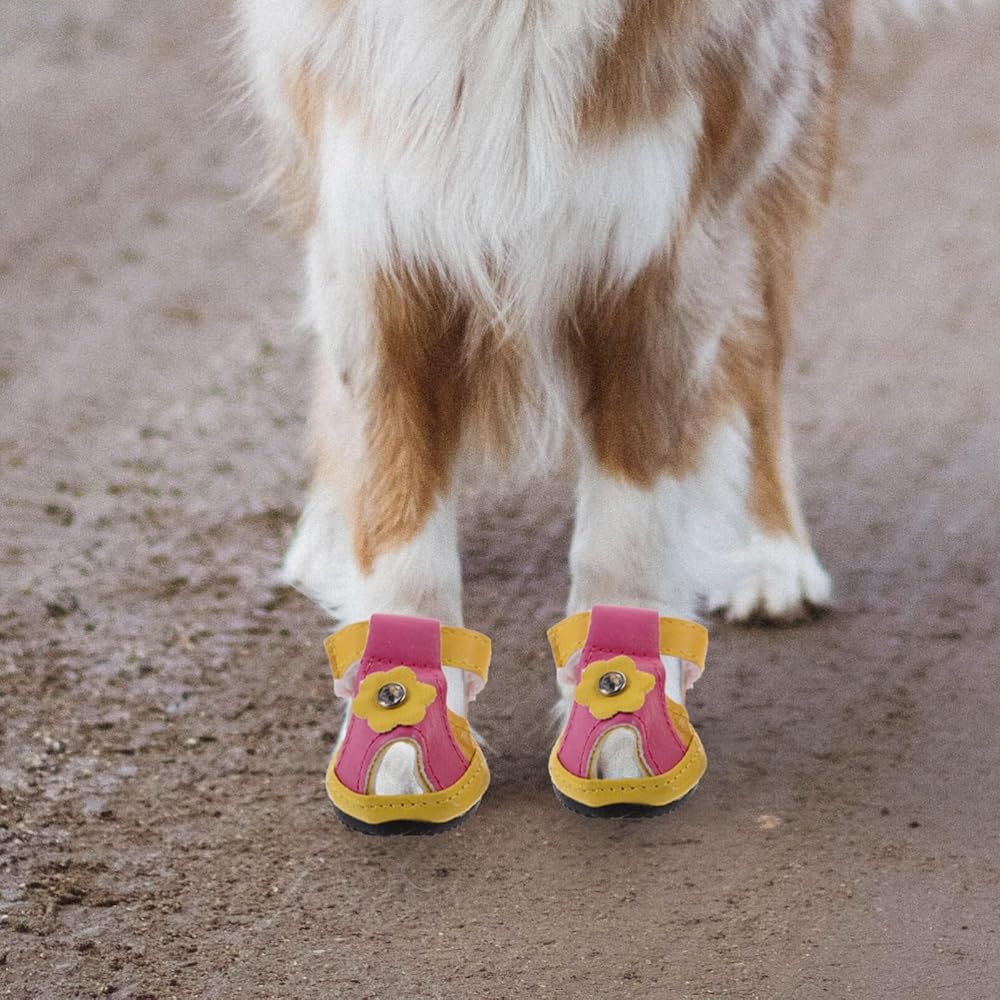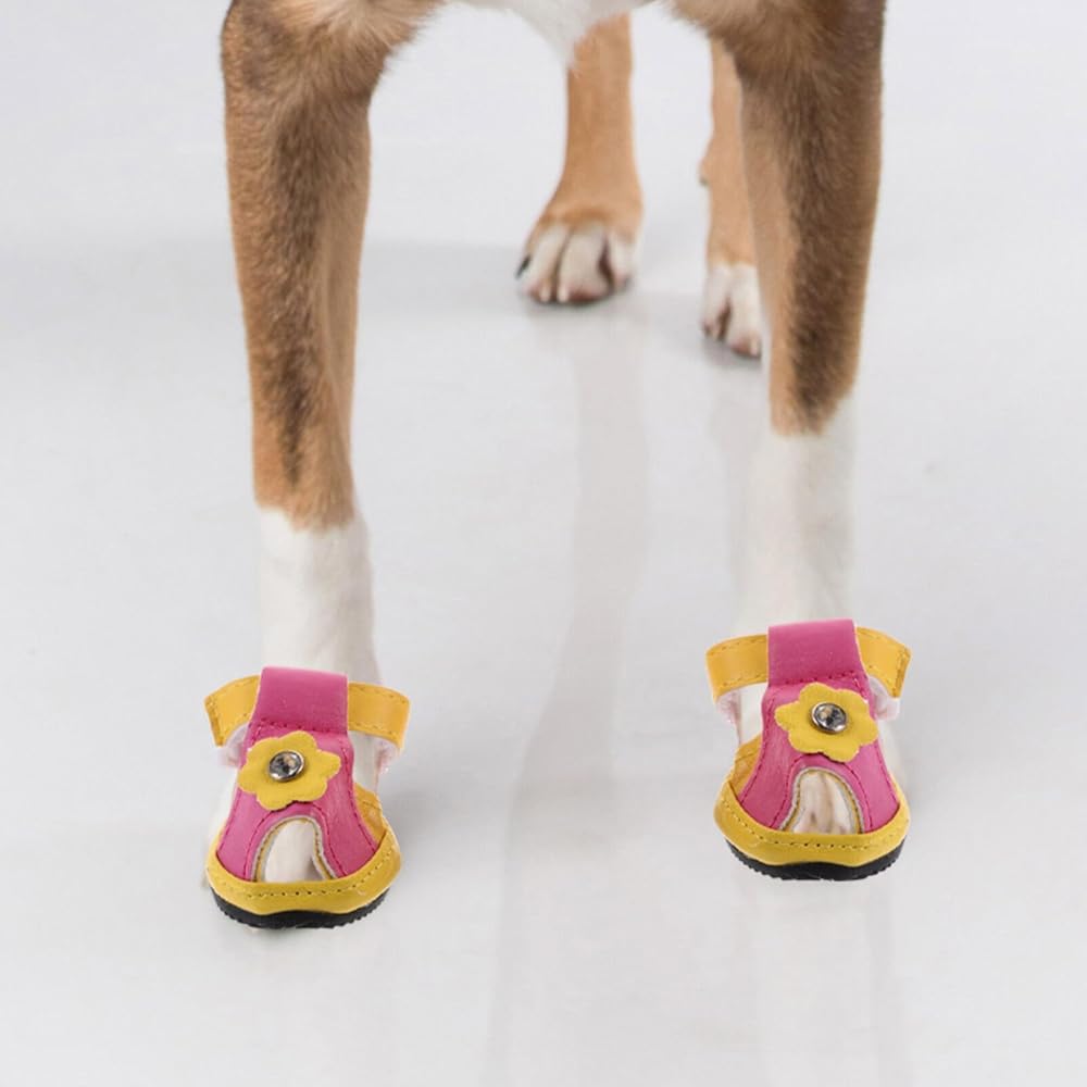 This is a set of 4 pieces pet dog shoes.The flexible sole makes the dog more comfortable, with 5 sizes to choose from. Dog shoes for summer, protect your pet avoid burned when walking on hot pavement, deck and beach.