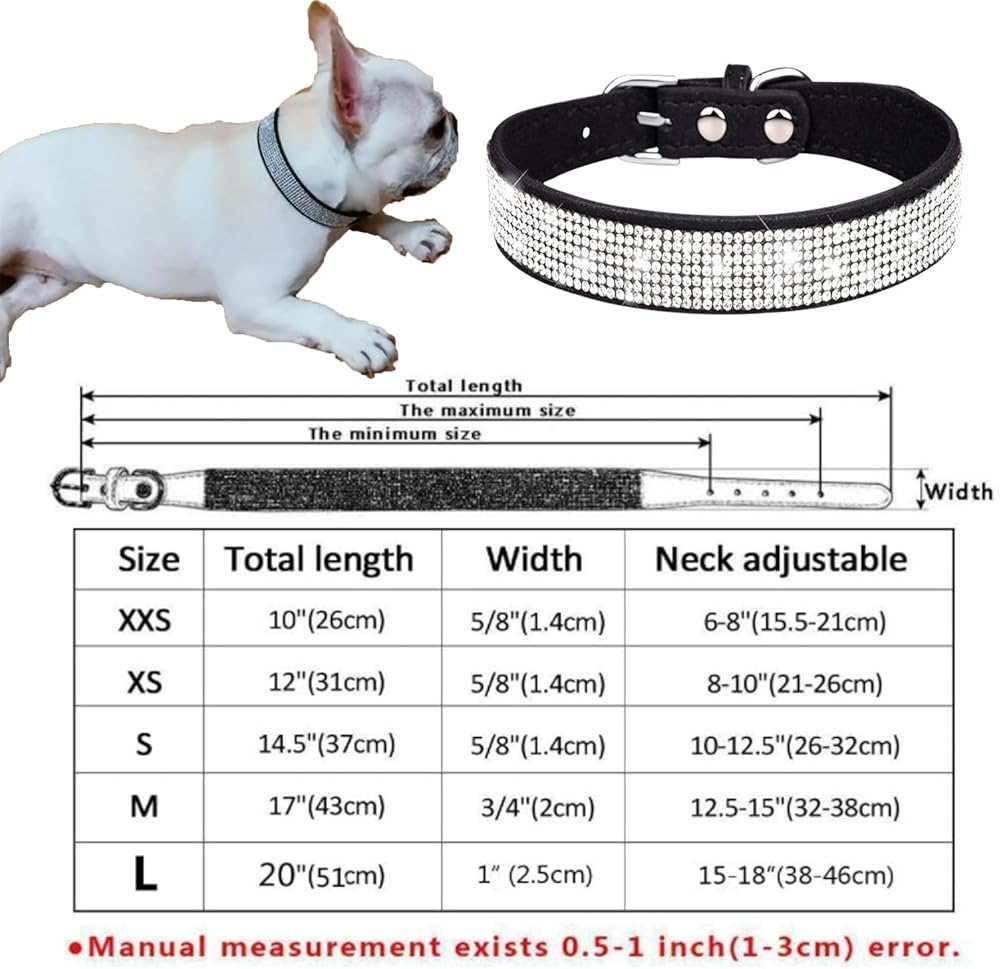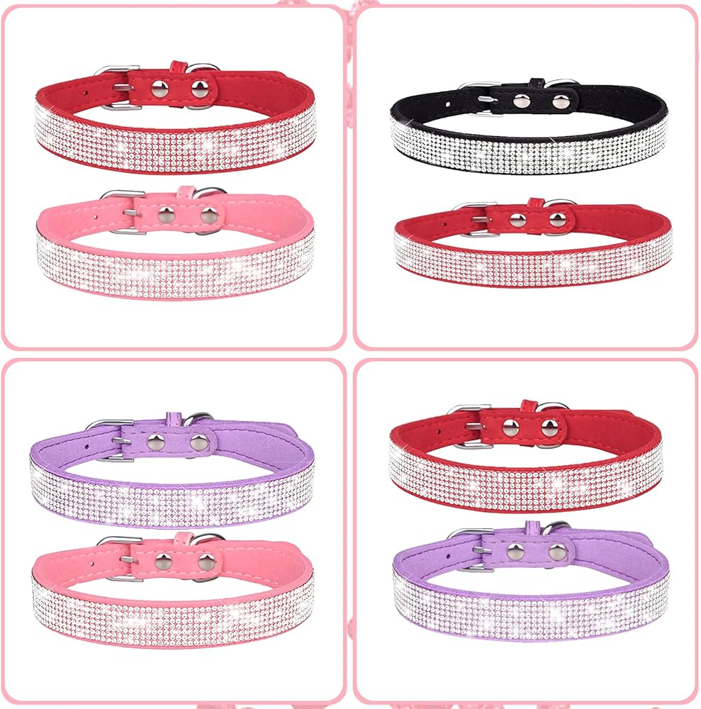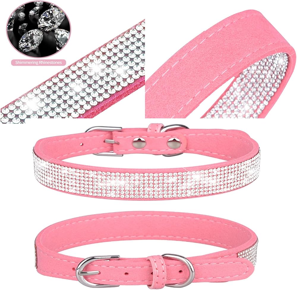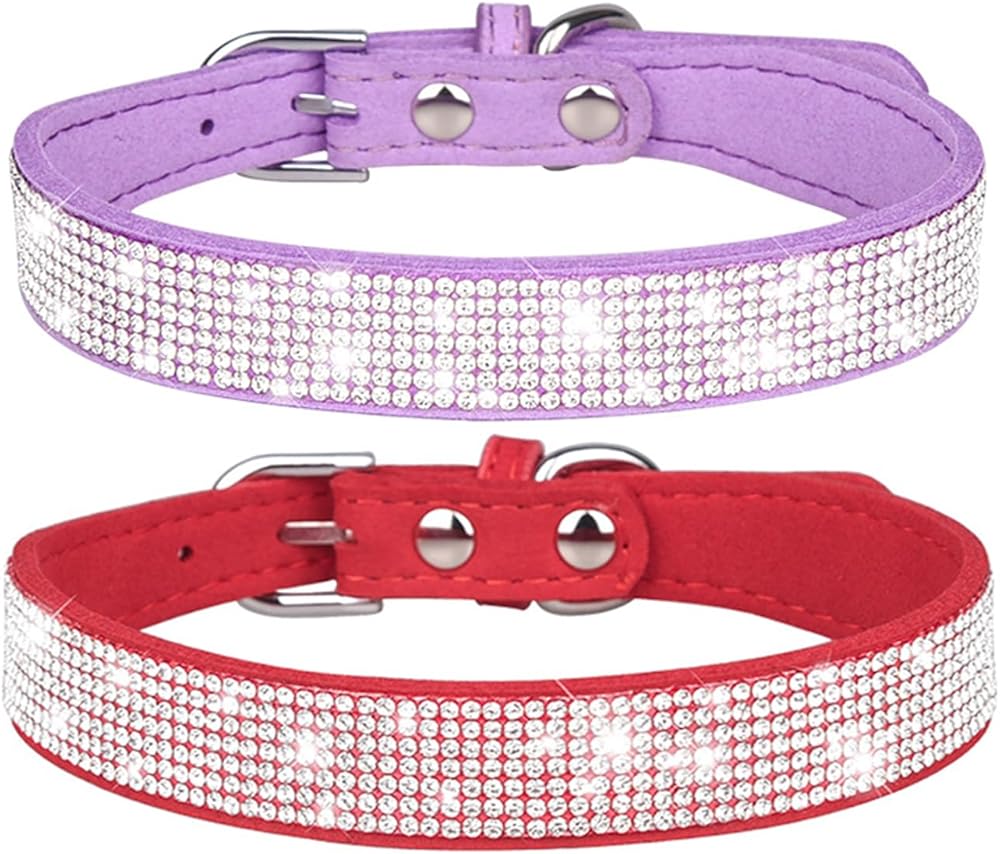 HIGH QUALITY MATERIAL: Suede microfiber, soft texture, comfortable and breathable, durable, comfortable to wear, will not hurt the dog's fur, can protect the dog's neck well.use for cat collars also.bling dog collars for small dogs, bling dog collars for medium dogs , bling dog collars for large dogs. STYLISH DESIGN: High-quality hot diamonds are not easy to fall off and sparkling, providing a fun and amazing pet neck ornament for your lovely dog. it will help you get tons of compliments from friends, neighbors or other passersby. VERY DURABLE: High quality zinc alloy fasteners, strong and durable, no rust. MULTIPLE COLORS AVAILABLE: Pink dog collar, black dog collar, purple dog collar, rose red dog collar. 5 eyelets are adjustable, small dog collar, medium dog collar, large dog collar. WARM PROMPT: The collar does not stretch itself, please make sure leave only 20 fingers between collar and dog neck. a properly fitting collar and harness won't leave any room for your dog to chew.