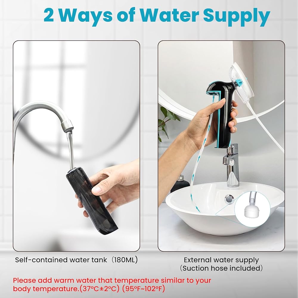Upgrade Design: our ear wax cleaner earwax removal kit has 2 ways of water supply, self-contain water tank and external water supply, please add warm water which is similar to your body temperature. With the special ear cups, the water can't splash anywhere, so you can use it anywhere