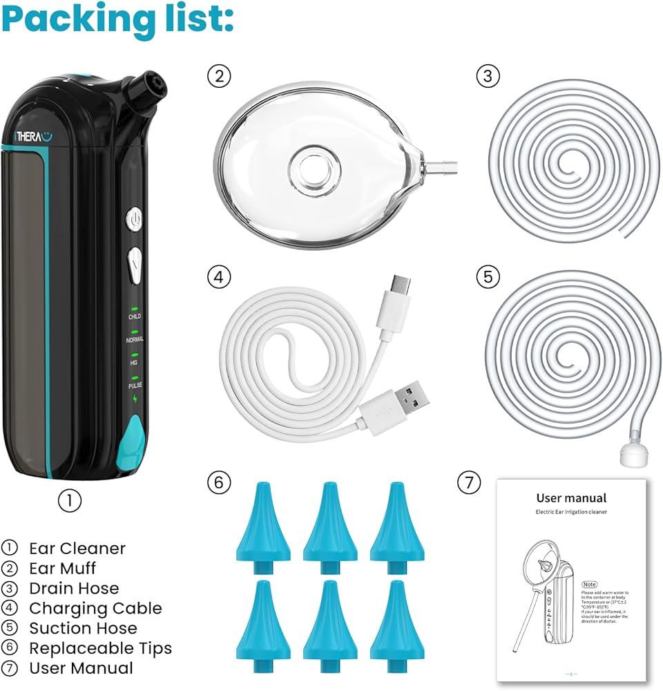 What You Get: Electric ear cleaner *1, spray nozzle*6, ear cups*1, drain hose(120cm)*1, suction hose(100cm)*1, charging cable*1, storage bag*1, instruction manual*1.We also provide friendly customer service, feel free to contact us about any questions