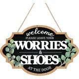 ▲USAGE: The no shoes inside wood sign with green leaves and bows, make your family feel happiness every day . It comes with jute rope,and need prepare a nail to hang them on wall as you like.