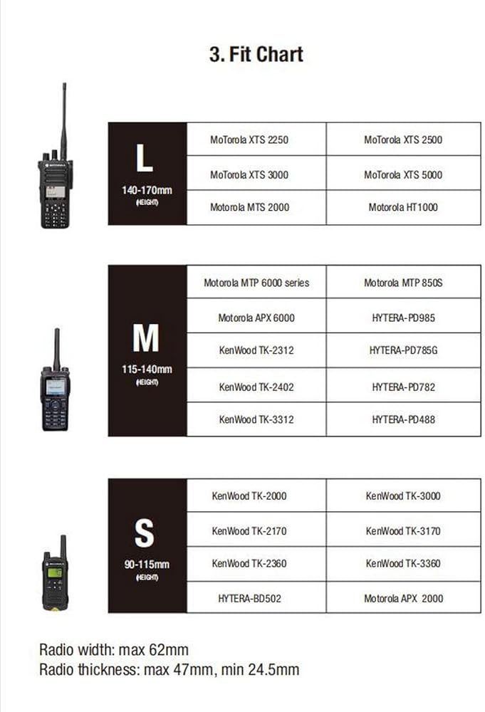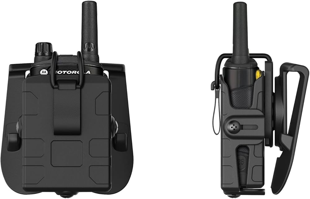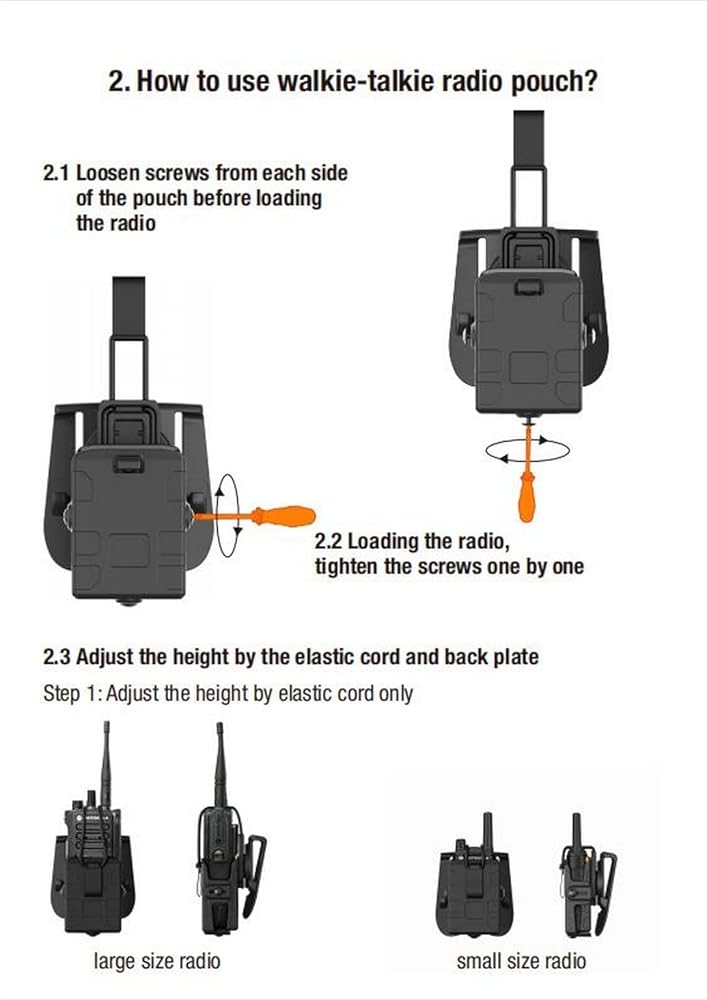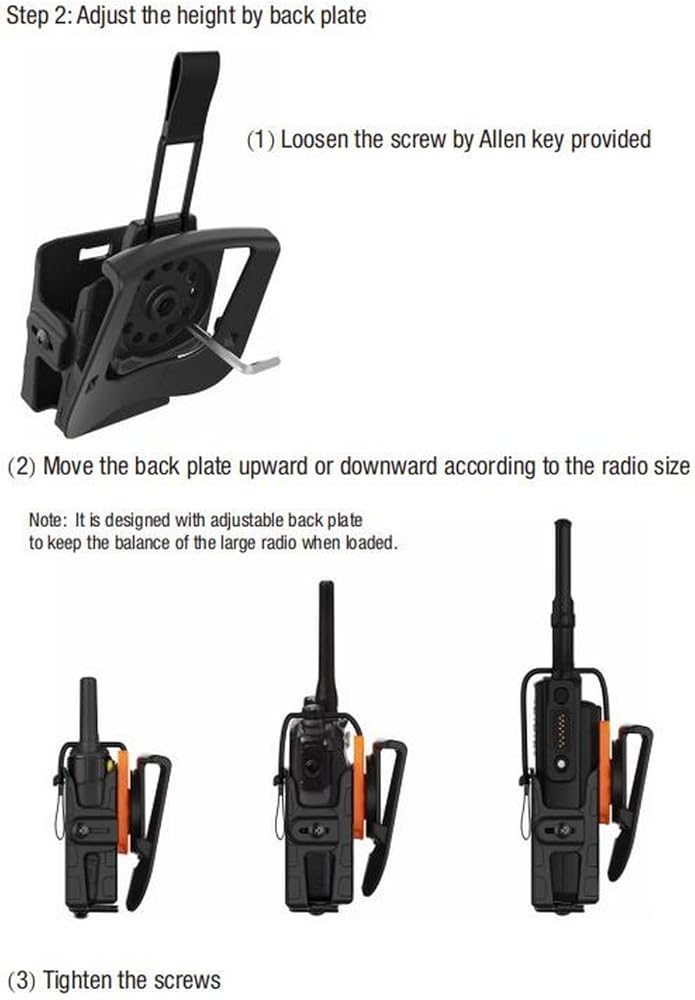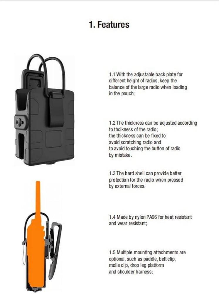 · Durable & Easy to Maintain walkie talkie is creatively produced of strong polymer to provide firm protection and safe carry. It's durable for long-time use, easy to clean with wet cloth or water, and not easily deformed. Dimensions for radio fit: maximum width: 2.4 inches, Minimum depth: 1 inch, maximum depth: 1.85 inches · Tool-free Adjustment Easily complete tension adjustment with 2 front screws. · Multiple Carrying Attachments Multiple carrying attachments are available, including paddle, belt loop, belt clip, MOLLE attachment, low ride belt loop, drop leg platform, and shoulder harness. · Law Enforcement | Tactical | EDC | Outdoor Suitable for law enforcement, tactical or outdoor activities like camping, hiking, climbing, and etc.