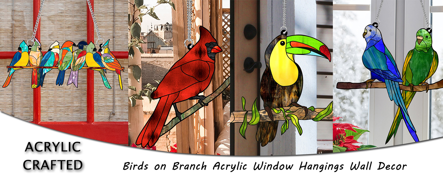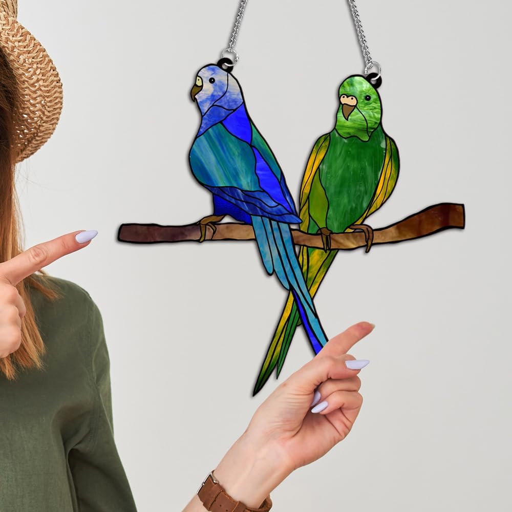 PARROT DECOR: This parrot decor is Acrylic panel crafted, beautifully painted with bright colors. Featuring a blue and a green parrots on branch, the parrot window hanging with vibrant colors will add a lively and eye-catching touch to your home and office.