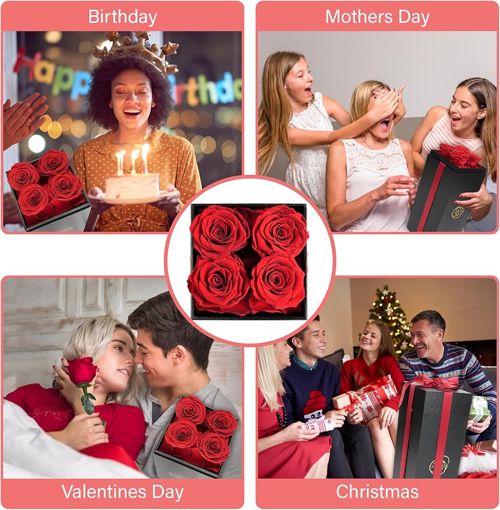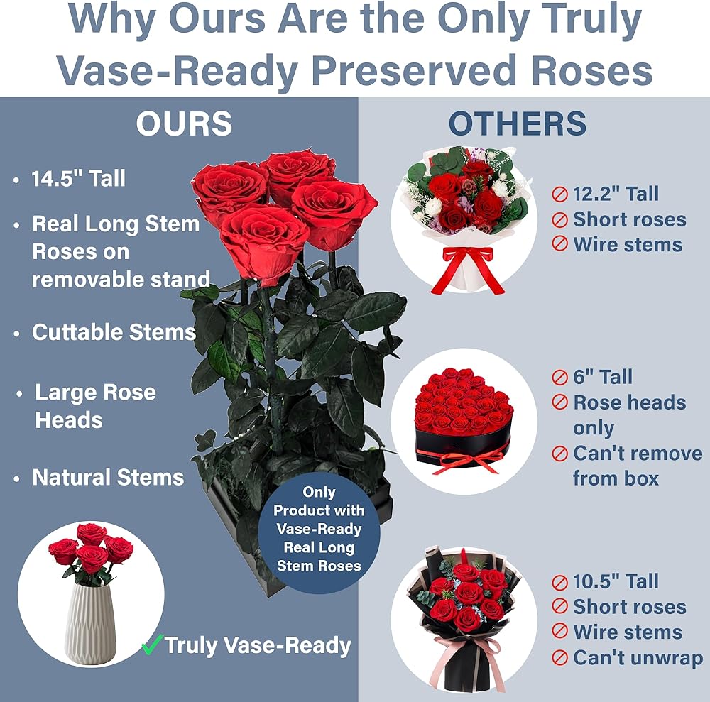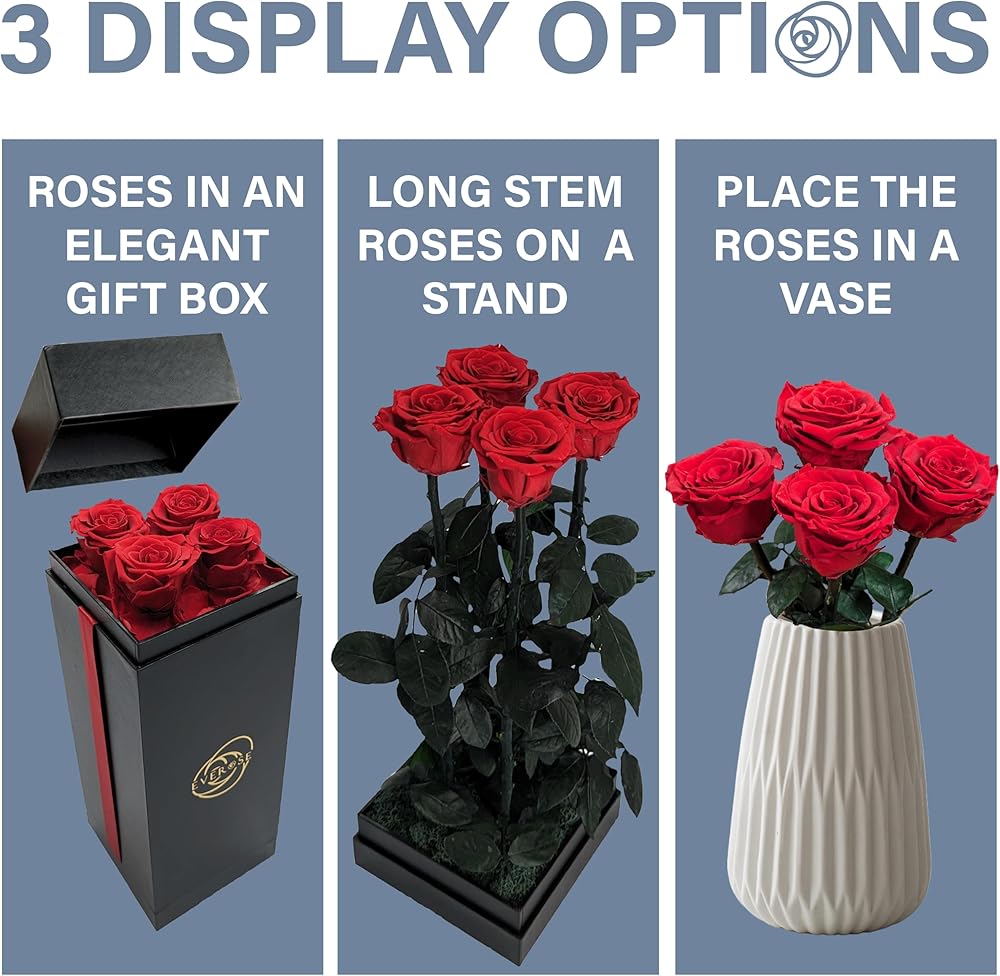 Preserved Real Rose Flowers for Delivery Prime – 4 Long Stem Forever Roses in a Gift Box with 3 Display Options – Preserved Flowers for Wife, Grandma, Mothers Day, Valentines or Birthdays (Red)