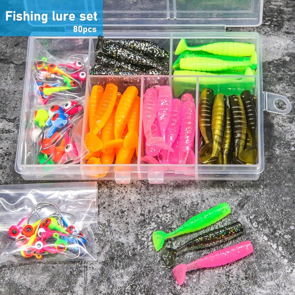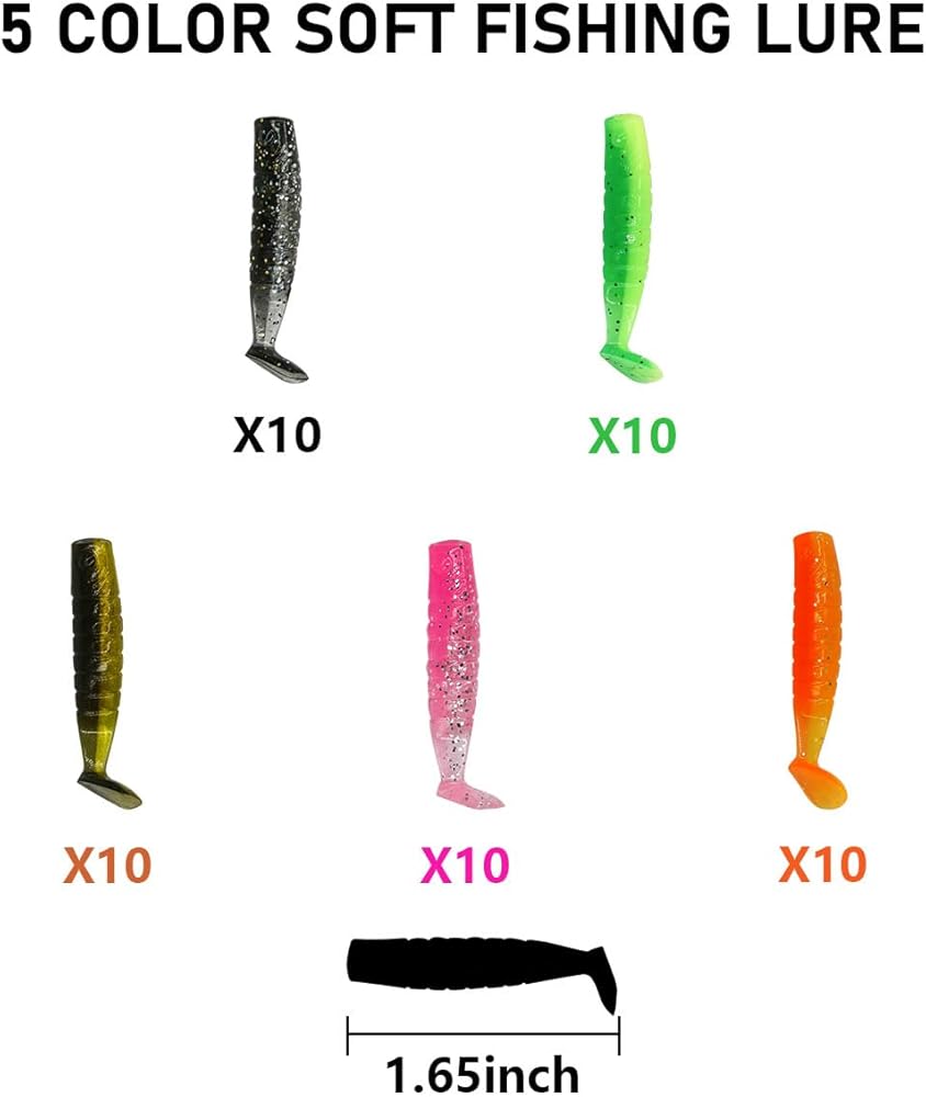 65pcs Crappie Jigs lures set comes with 50 soft lures and 15 fishing jig heads. Both soft lures and jig heads come in 5 different colors, the jig heads come in 3 different sizes (1/16 oz 1/32 oz and 1/8oz) and can be paired according to the fishing environment.