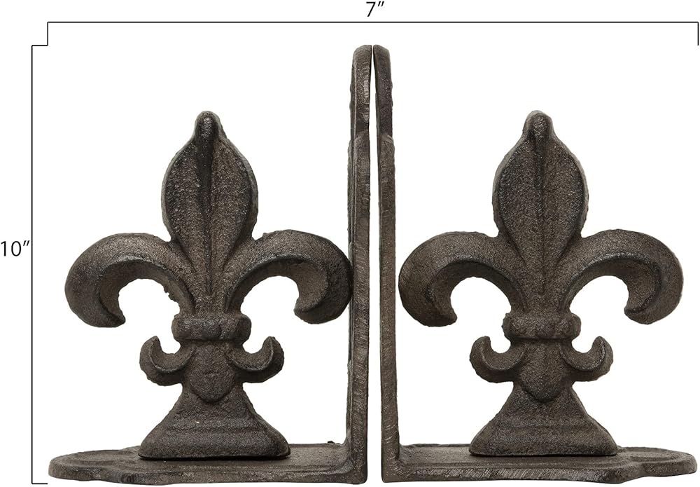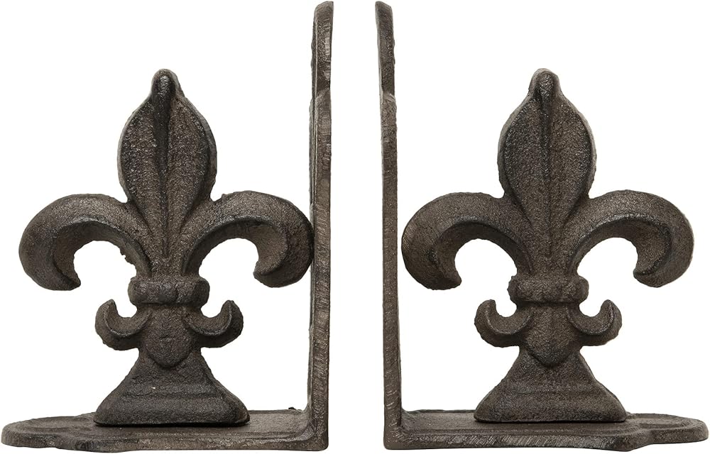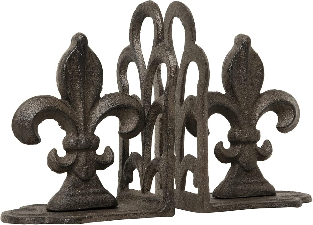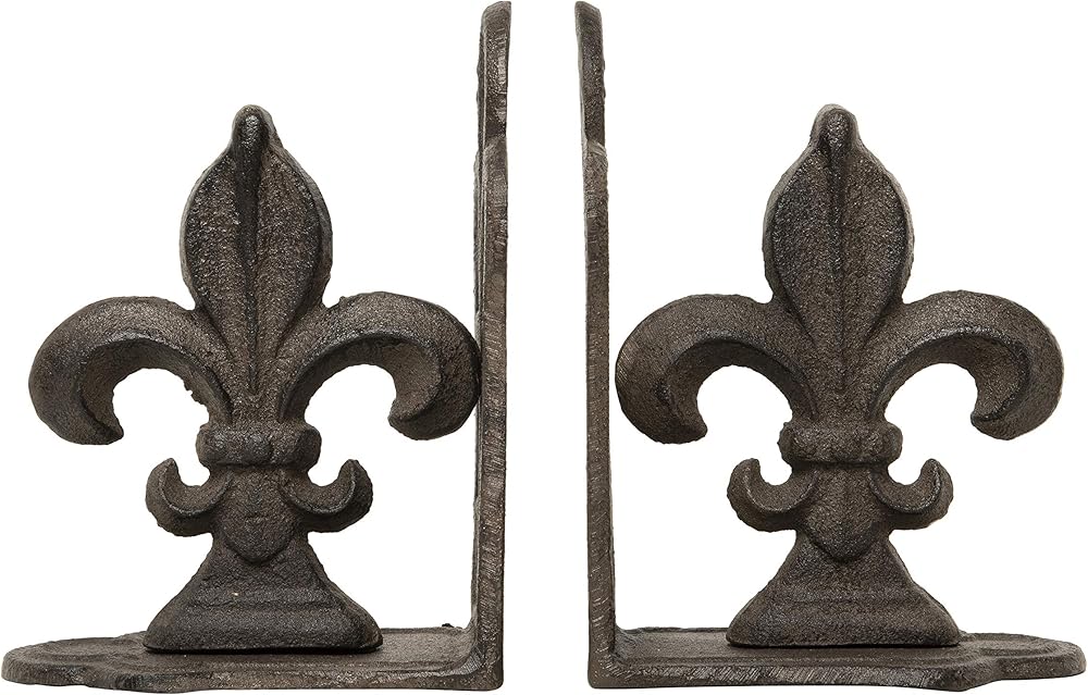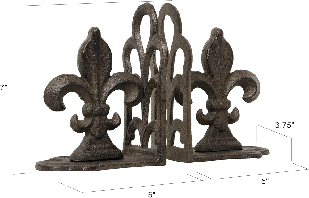 These brown metal fleur de lis bookends are a fun and unique way to organize and decorate the book collection. They are made of metal, which is a sturdy and heavy material that can hold up books of different sizes and weights. They have a fleur de lis shape, which is a symbol of royalty and nobility. They have a brown finish that gives them a classic and antique look, adding some French-inspired elegance and charm to the home décor. They can be used to group any favorite books inside them or as a decorative accent in any space. They are suitable for any vintage, rustic, or country style of home décor, as they complement any color scheme and material. They are great for displaying books in the home or office. Each bookend measures 5 inches long, 3.75 inches wide, and 7 inches high. To maintain their beauty, wipe them with a dry cloth. These bookends are a versatile and stylish addition to any home.