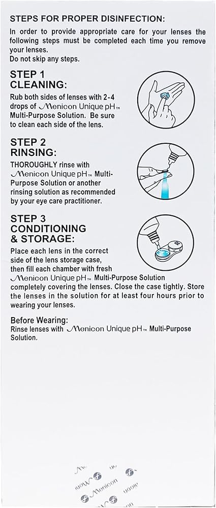 CLEAN CONTACT LENS: Rub both sides of your lenses with Menicon Unique-pH Multi-Purpose Solution. Be sure to clean each side of the lens
