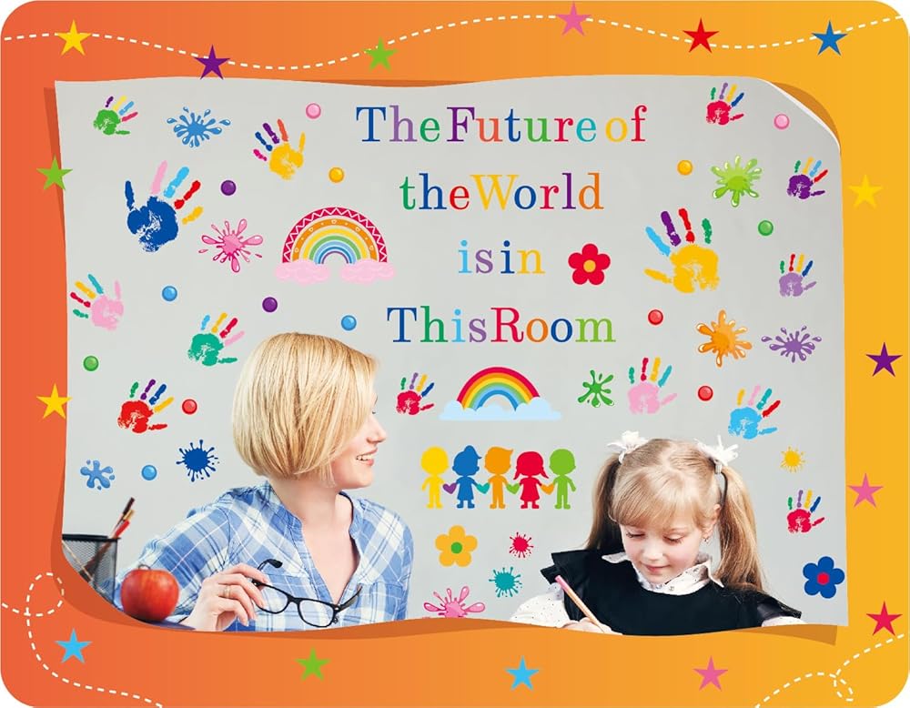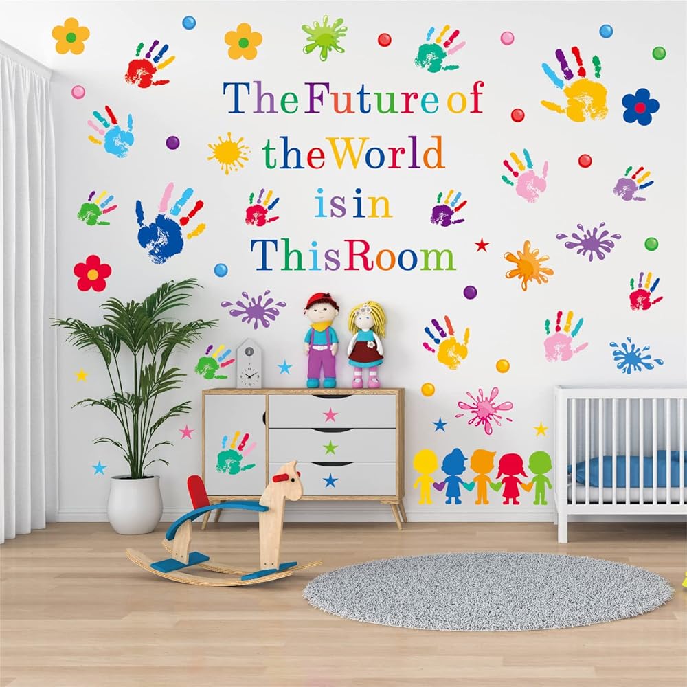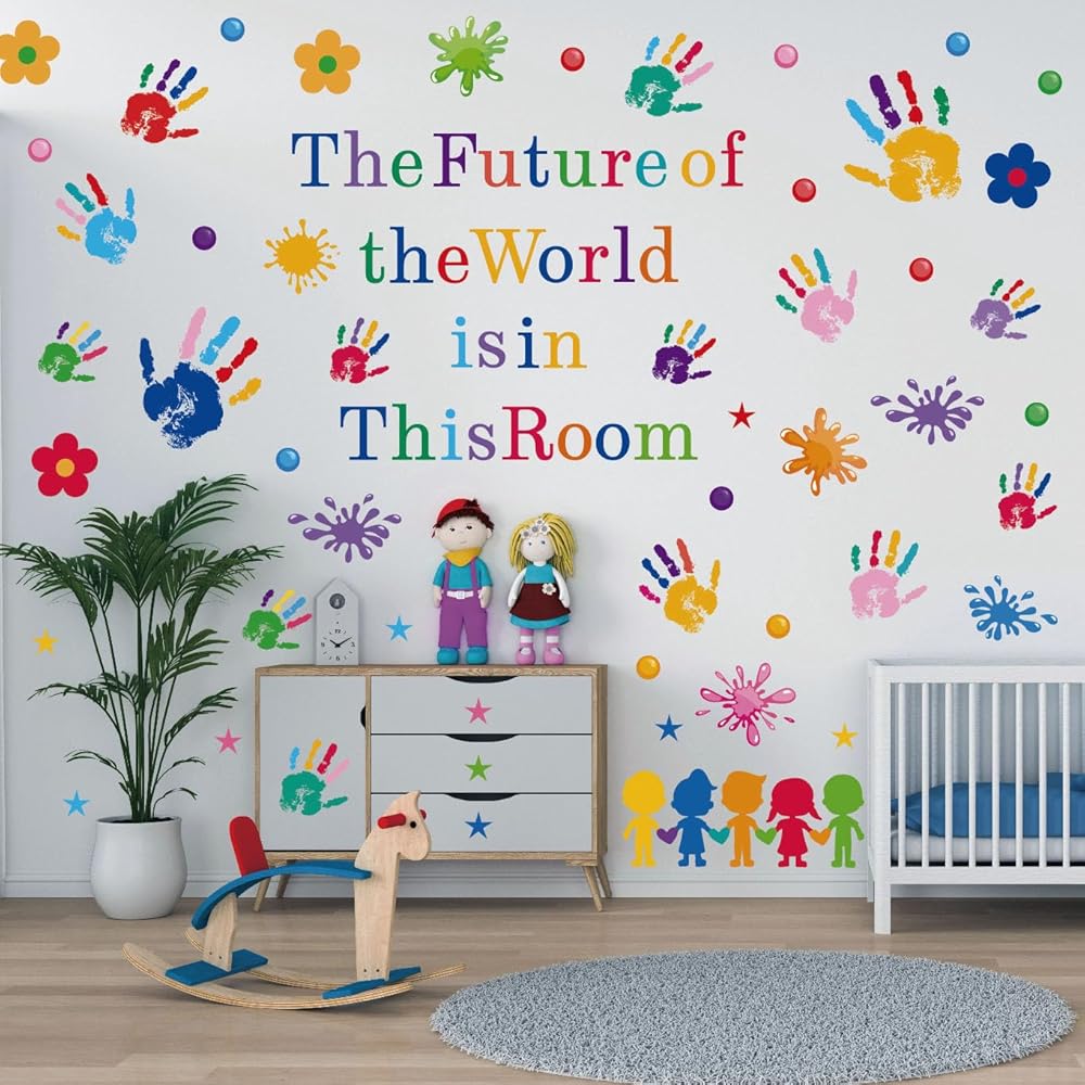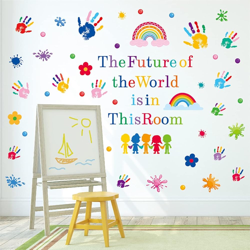 ✿ What You Will Get: You will receive 7 sheets in 86 pieces of colorful inspirational wall decals, each sheet's approx size is 12.5*10.2 Inch. These decals combine inspirational quotes with hand prints and watercolor splash stickers. The future of the world is in this room, bright letters and large amounts of colorful wall stickers can be mixed for instant stylized wall decoration and inspiration.